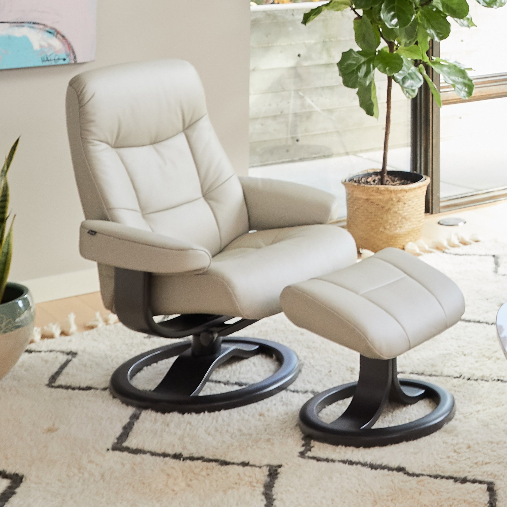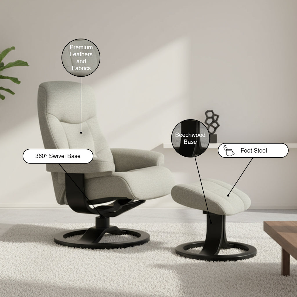 The Fjords Muldal Recliner combines innovative design with practical features for daily comfort. Its Active Release System™ continuously supports the neck and lumbar region, adapting to your posture as you recline. The manual pushback mechanism and 360° swivel base provide versatile positioning for reading, working, or relaxing. Upholstered in premium leather or durable fabric, with a matching ottoman for leg support, it’s perfect for high-traffic areas.