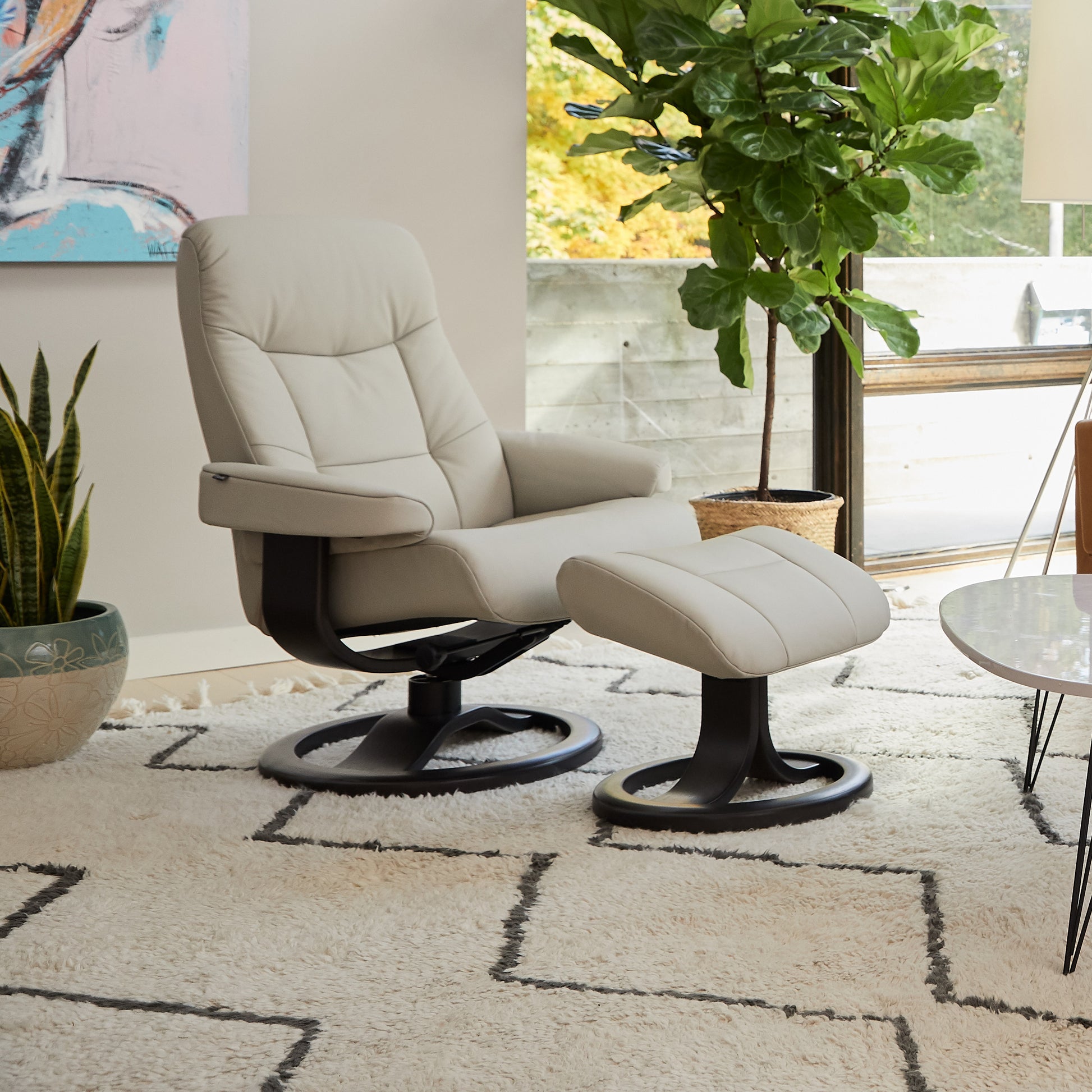 Designed for comfort and proportion, the Fjords Muldal Recliner offers small (29.5″W × 32.5″D × 40.5″H) and large (32.3″W × 35.5″D × 41″H) sizes, making it perfect for both medium and large spaces. The deep seat and 18″ seat height provide generous seating for extended lounging, while the accompanying ottoman expands legroom and enhances versatility.