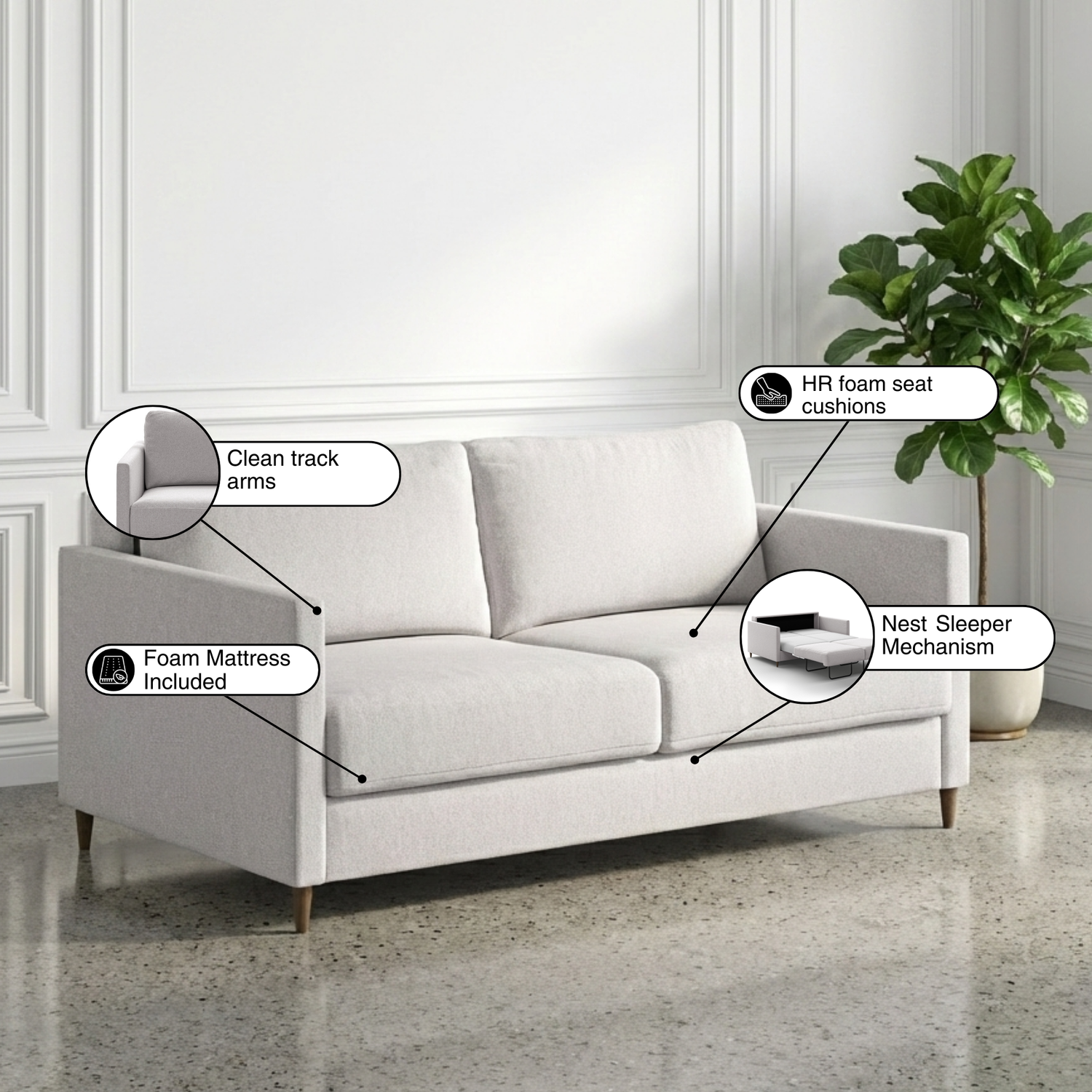 When practicality matters, Elfin truly shines. Its clever Nest function smoothly converts the sofa into a Full XL, Queen, or King bed, while the foam mattress ensures overnight comfort for guests. Wrapped in durable fabric with clean track arms, Elfin brings everyday comfort and thoughtful functionality into one beautifully designed piece.
