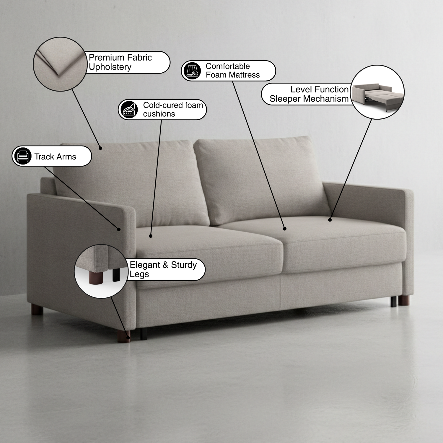 The Luonto Polar Fabric Beige Sleeper Sofa With Level Function is thoughtfully designed to bring clarity and confidence to your space. With a detailed dimensional image, you can clearly visualize its proportions- from the slim 39.75" depth to the balanced 35.5" height and generous width options. Whether you select Cot, Full XL, Queen, or King, the measurements help you plan your layout effortlessly, ensuring the sofa fits beautifully alongside your coffee table, accent chairs, or media console.