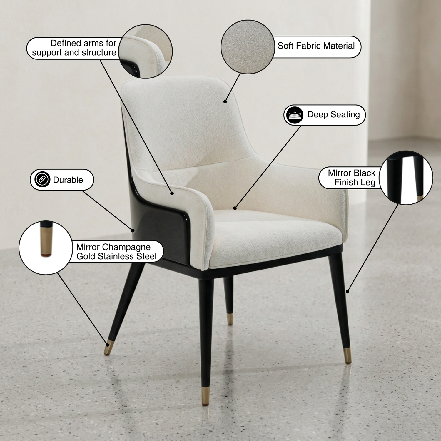 - Mirror Black Titanium Stainless Steel (SS) Offers a sleek, dark contrast with a reflective, deep finish, defining the chair's modern silhouette.