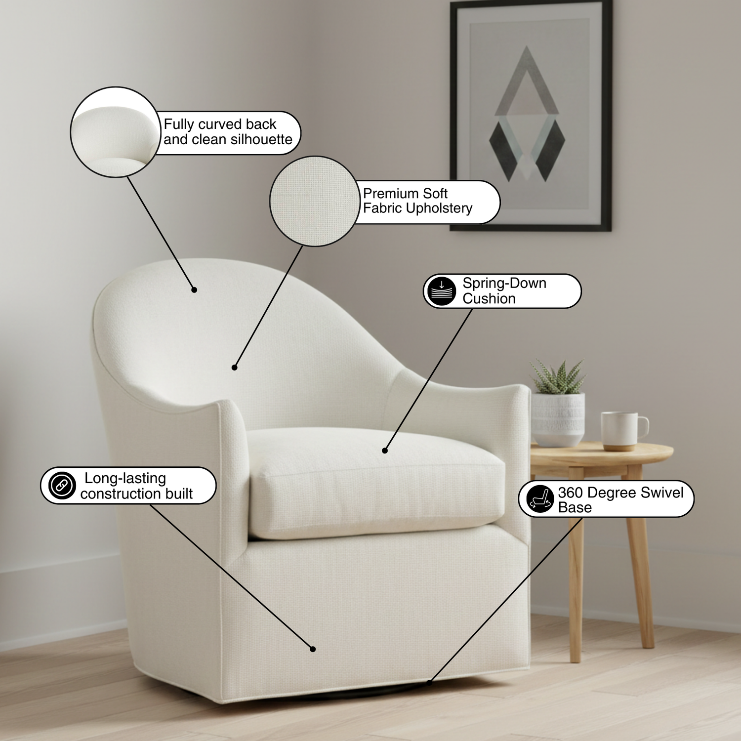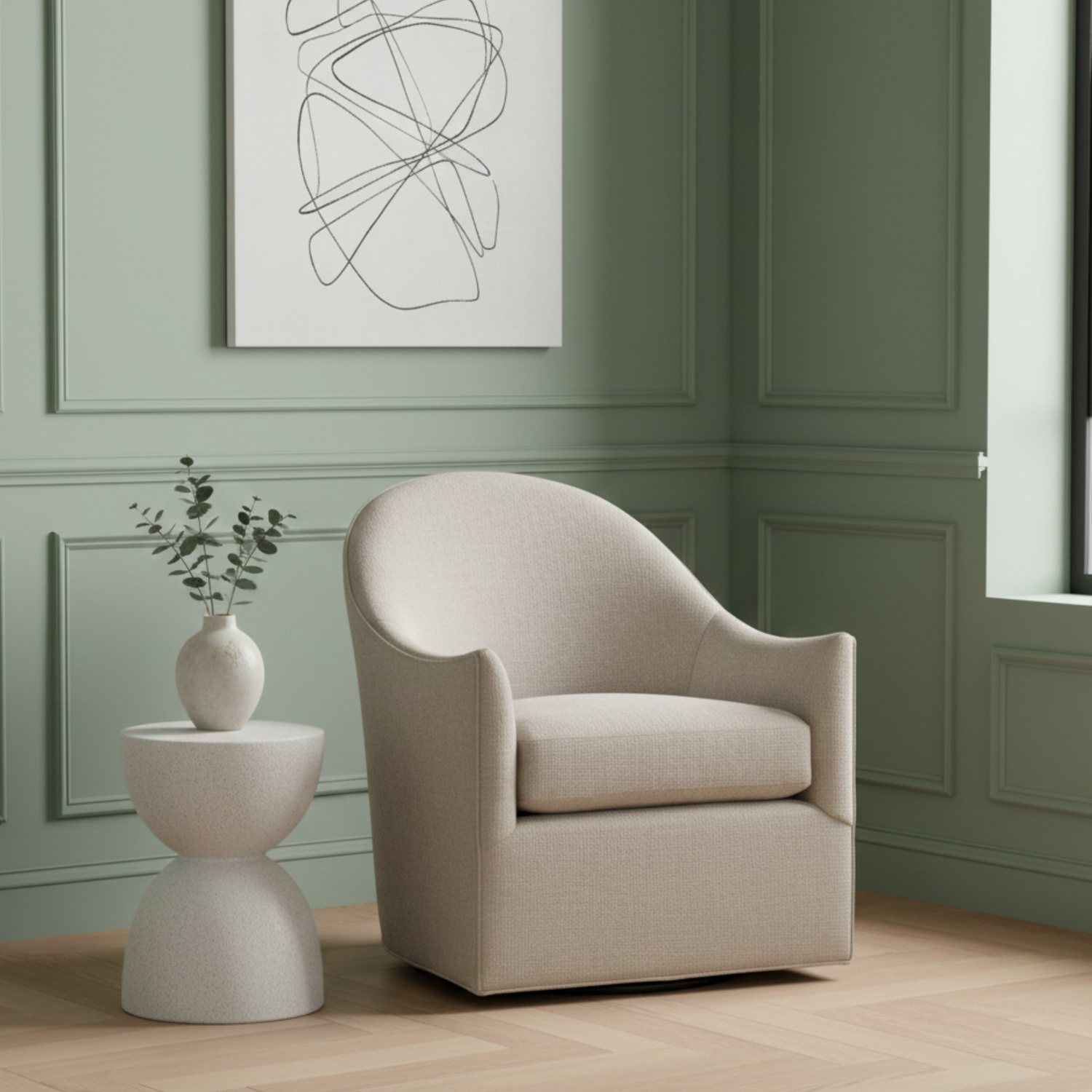 Settle into the Roscoe Swivel Accent Chair, where premium Lingo Oatmeal upholstery feels soft yet durable and easy to maintain for busy homes. A fully rounded back with subtle nailhead accents offers supportive, lounge-worthy comfort, while high‑resilience cushioning keeps its shape through movie nights and morning coffee alike.
