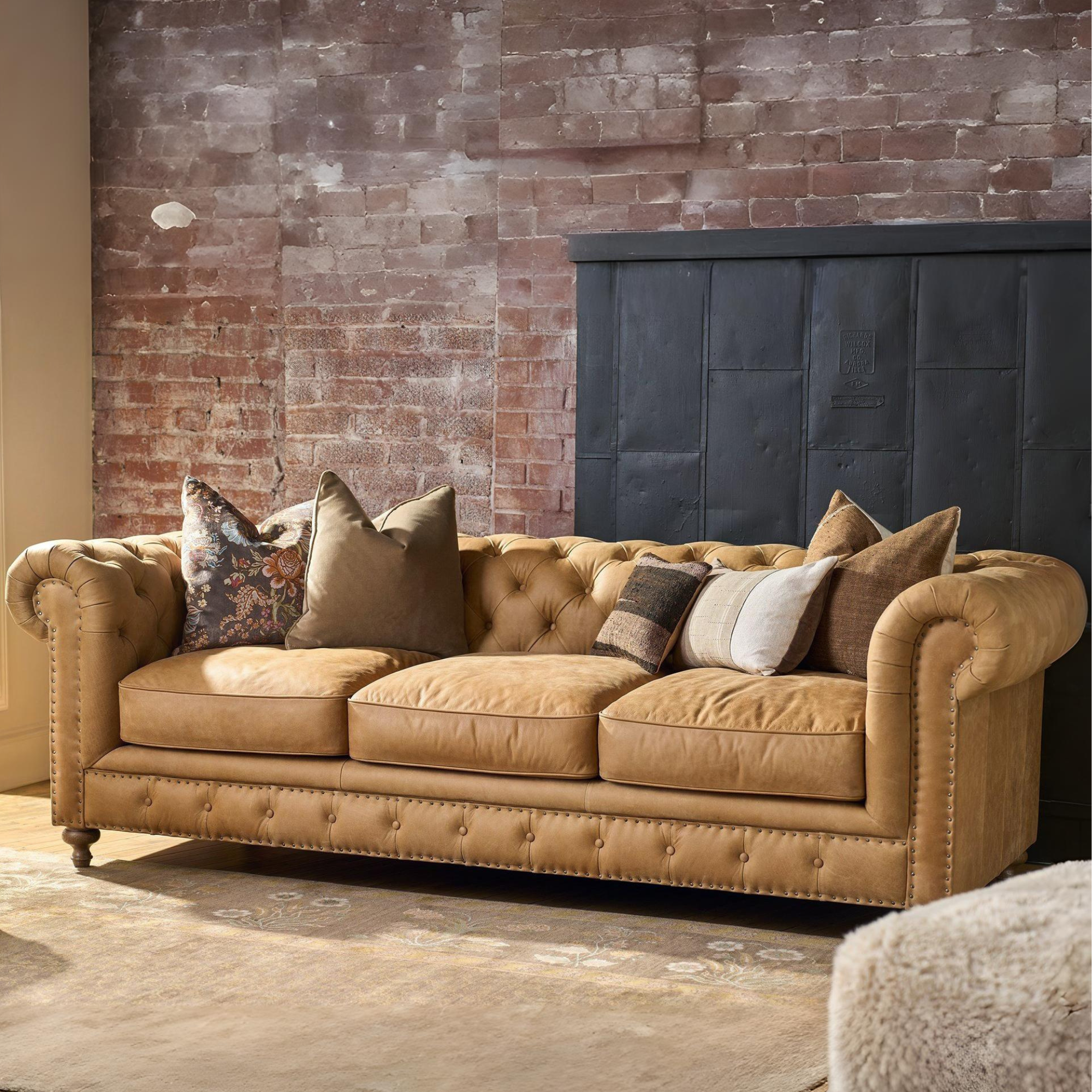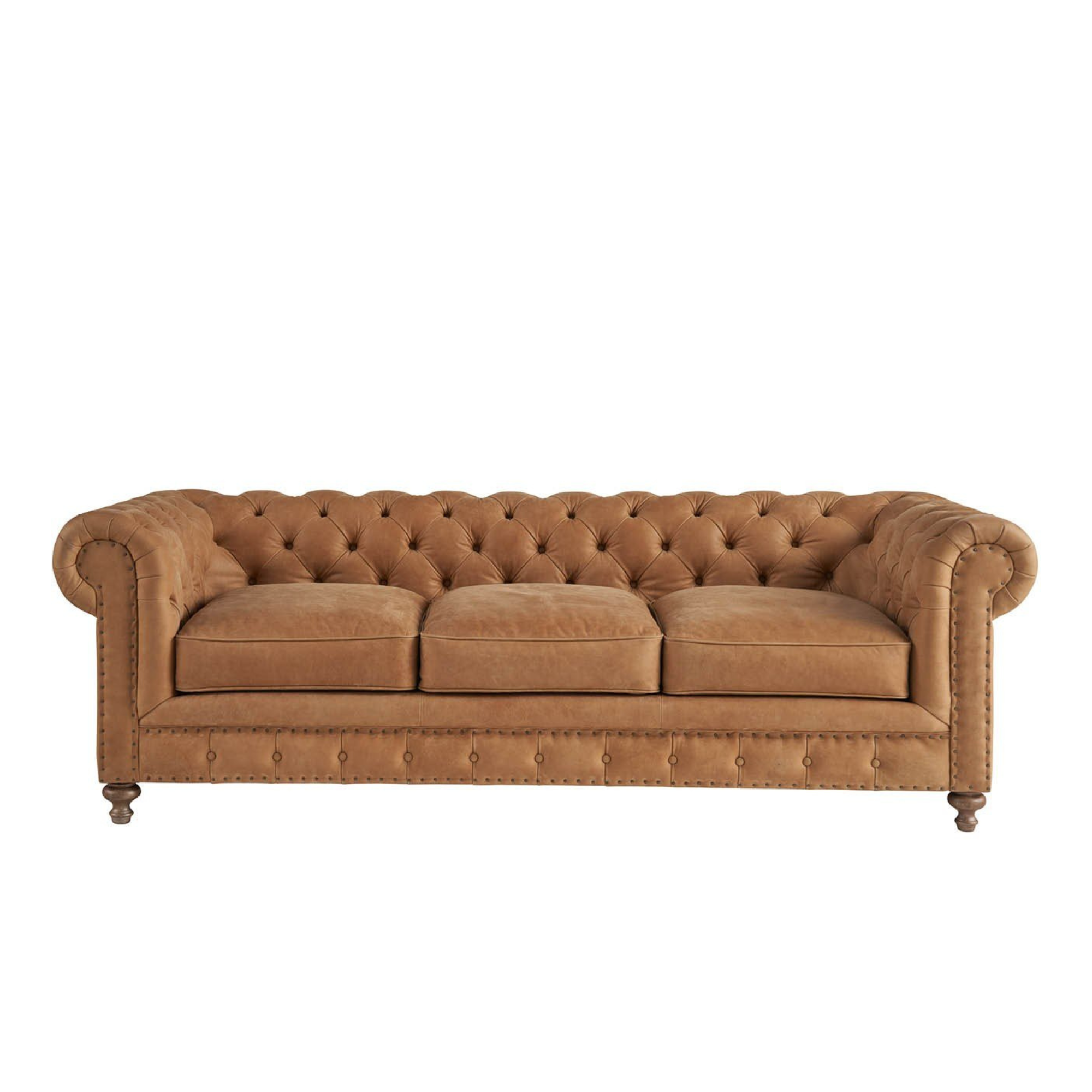 Elevate your living space with the Berkeley Leather Chesterfield Sofa. Beautifully upholstered in premium Winchester Sandstone leather, this sofa features deep button tufting, classic rolled arms, and hand-applied nailhead trim for a timeless, luxurious appeal.