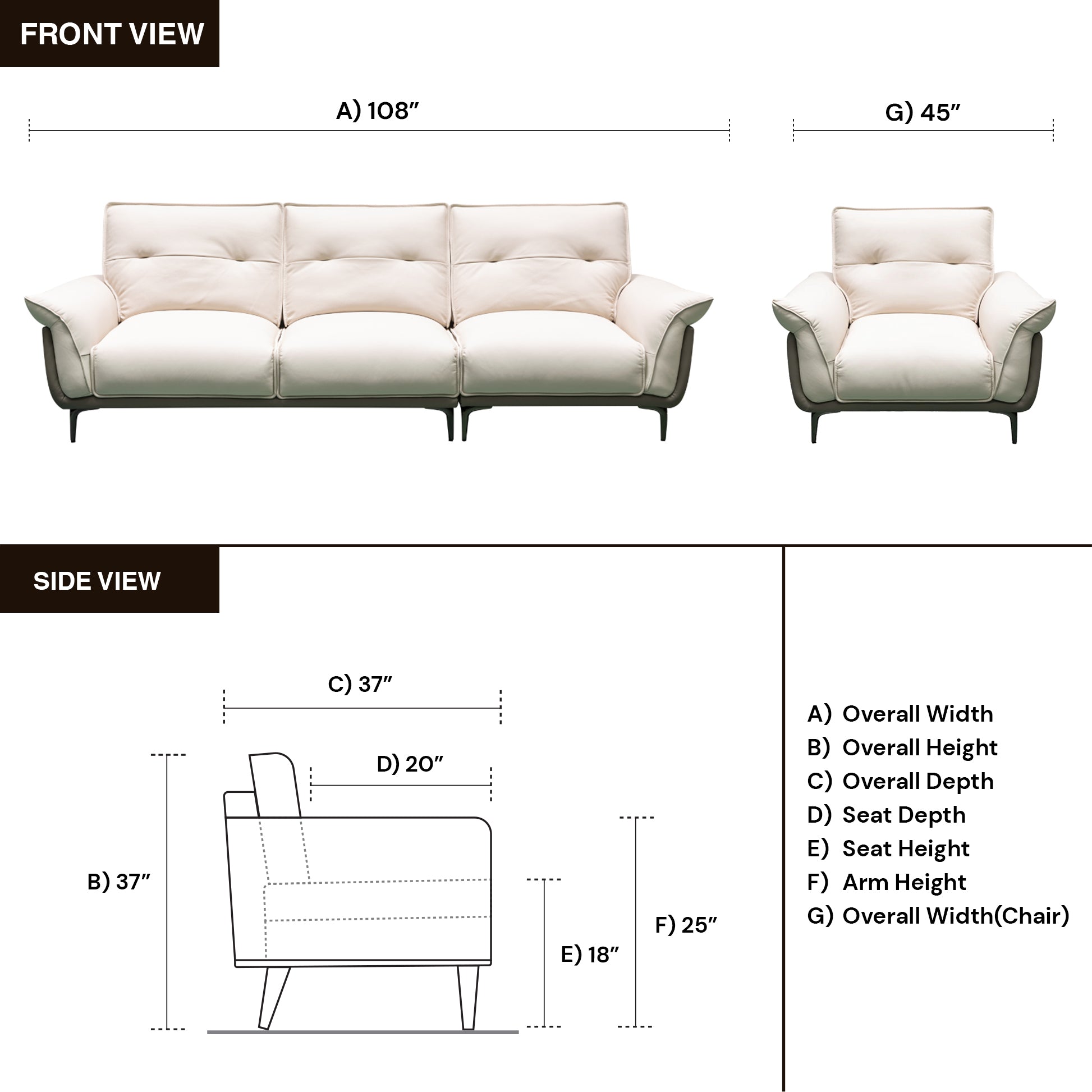 For a clear sense of presence, the three‑seater spans 108" wide with a 37" depth and 37" height, offering generous seating without overwhelming the room. The companion recliner measures 45" wide x 37" deep x 37" high, with a comfortable 18" seat height and supportive 25" arm height - proportions that fit seamlessly into most living spaces while keeping pathways open and styling flexible