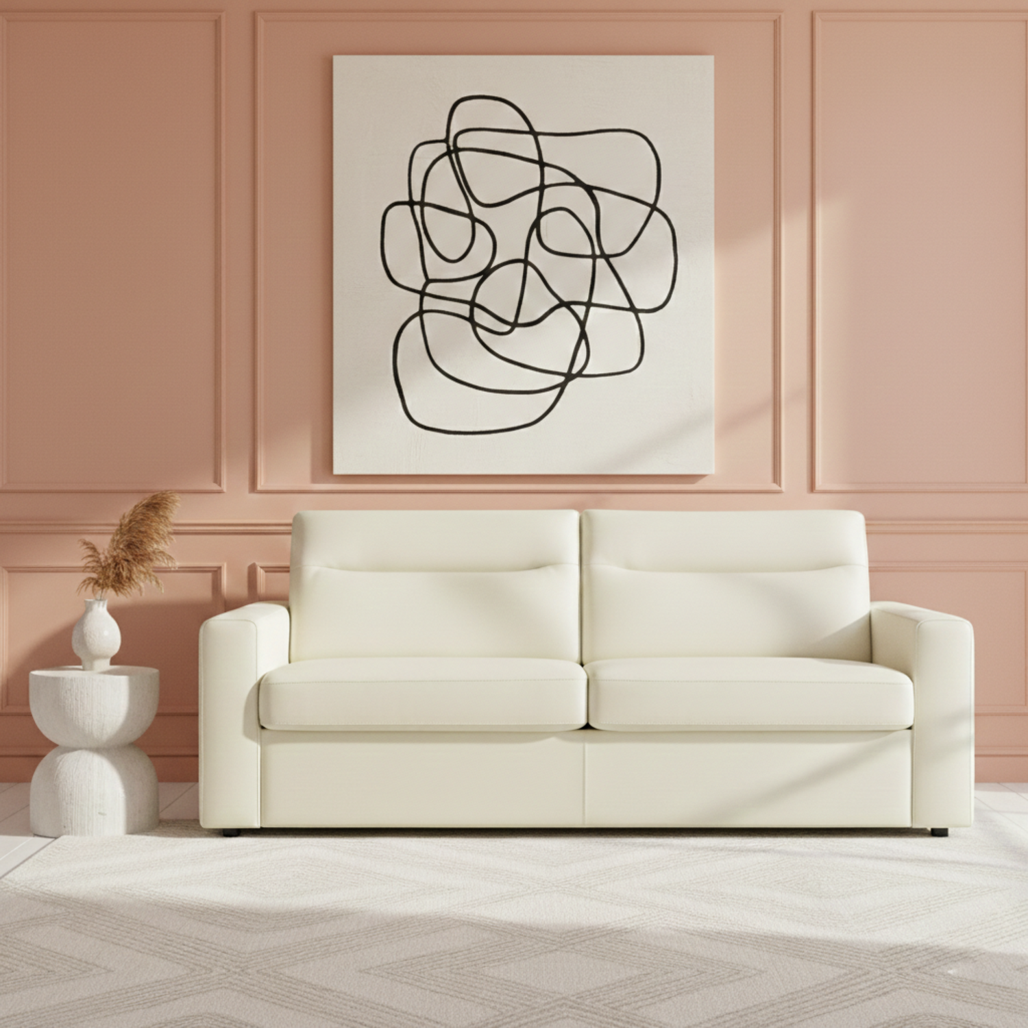 Available in White Coffee fabric or Gentle Taupe top‑grain leather, the Jamie sleeper sofa offers timeless options to suit your lifestyle. The fabric brightens interiors with a soft neutral tone, while the leather adds depth and luxury with its smooth grain.