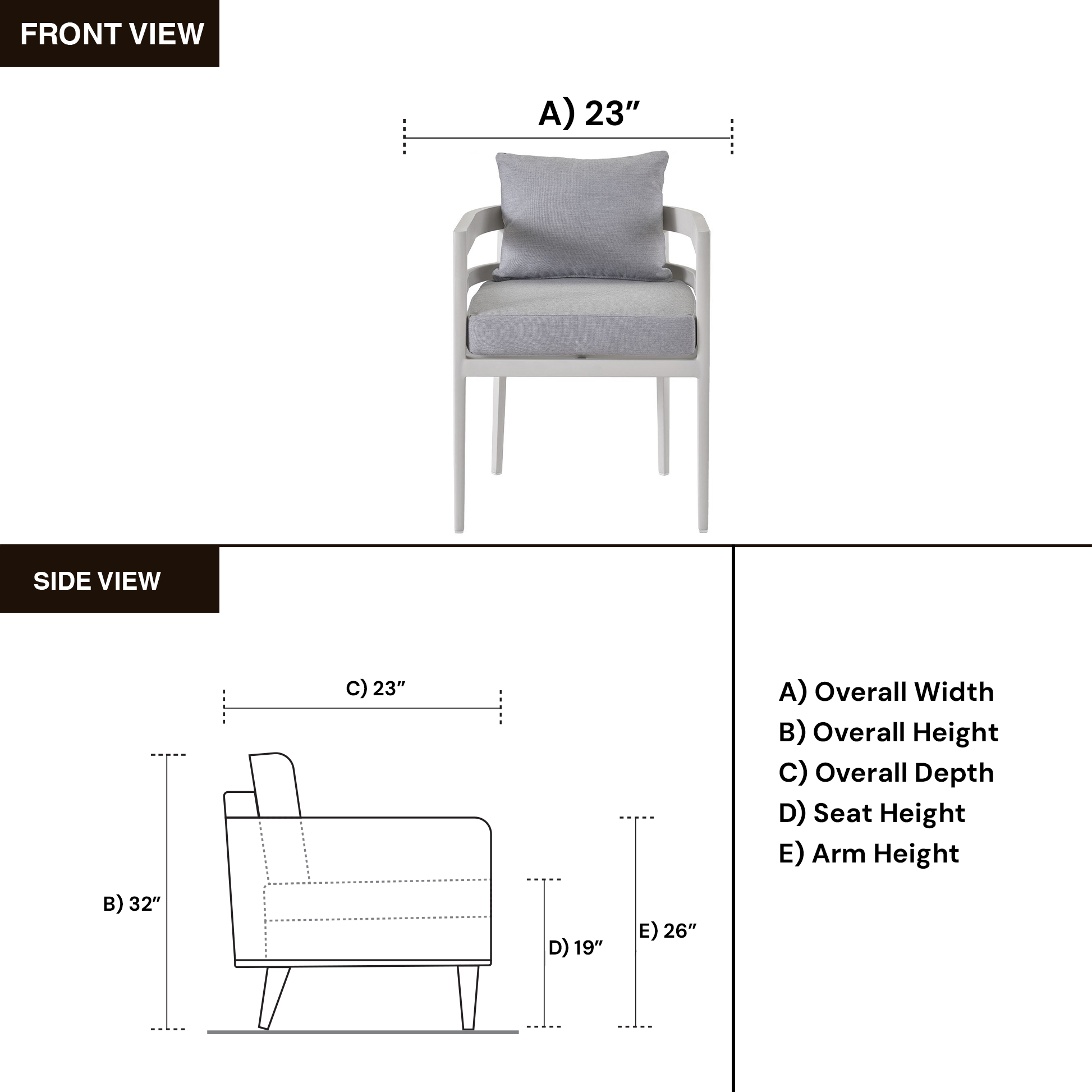 Designed for real comfort, the chair offers a supportive 19" seat height with the cushion and 16" without, complemented by a comfortable 26" arm height. Crafted from durable aluminum, it promises long-lasting beauty while elevating your home with clean lines, airy charm, and timeless coastal refinement.