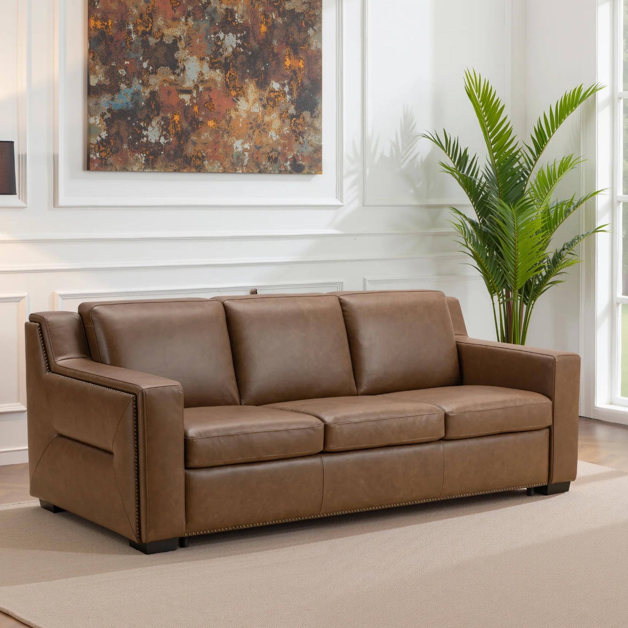 The Alaves’ generous proportions 86.6" wide, 38.2" deep, and 31.9" high styled with cozy accents like a side table, lamp, and decorative pillows. The sofa’s 18.5" seat height and 22.8" seat depth are emphasized through inviting angles, while the extended depth of 81.1" when open showcases its spacious sleeper function. The bronze nailhead trim and smooth leather finish add richness, reinforcing its premium appeal.