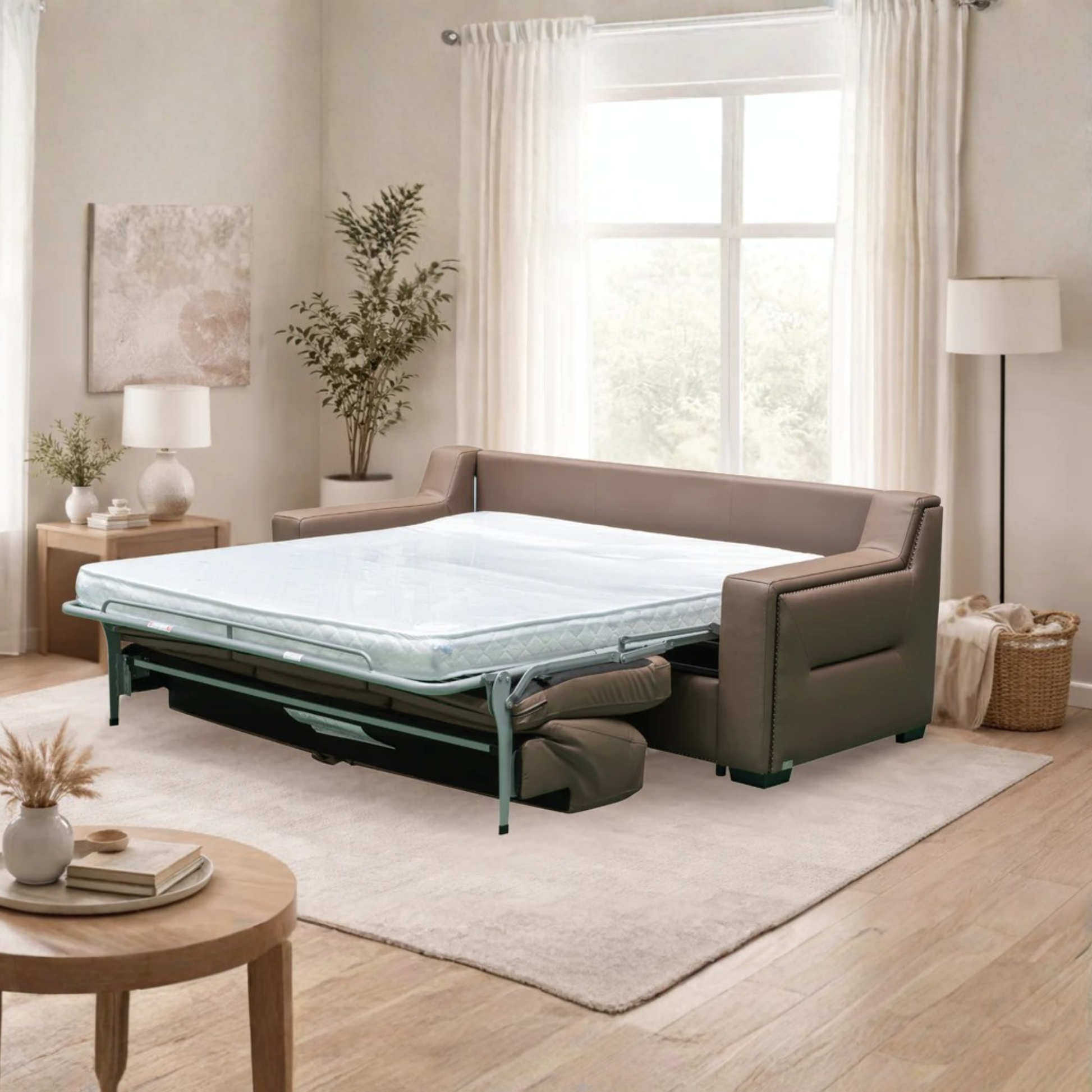 This angle emphasizes versatility and convenience. The image communicates how the Alaves is designed for modern living a sofa that transforms in under ten seconds without cushion removal. It tells the story of welcoming guests with ease, offering both refined seating by day and luxurious sleeping comfort by night