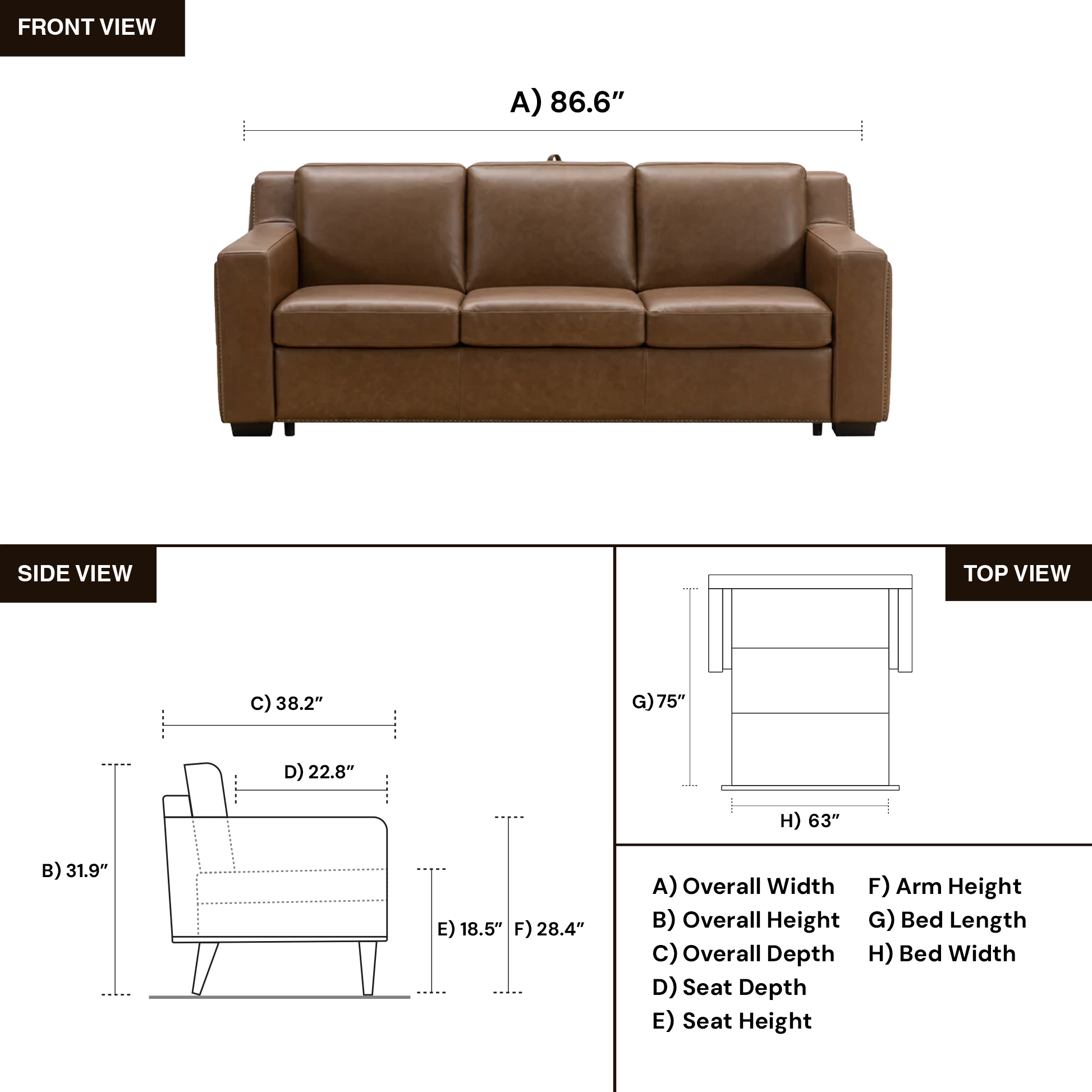 - Overall Dimensions W: 86.6" × D: 38.2" × H: 31.9"