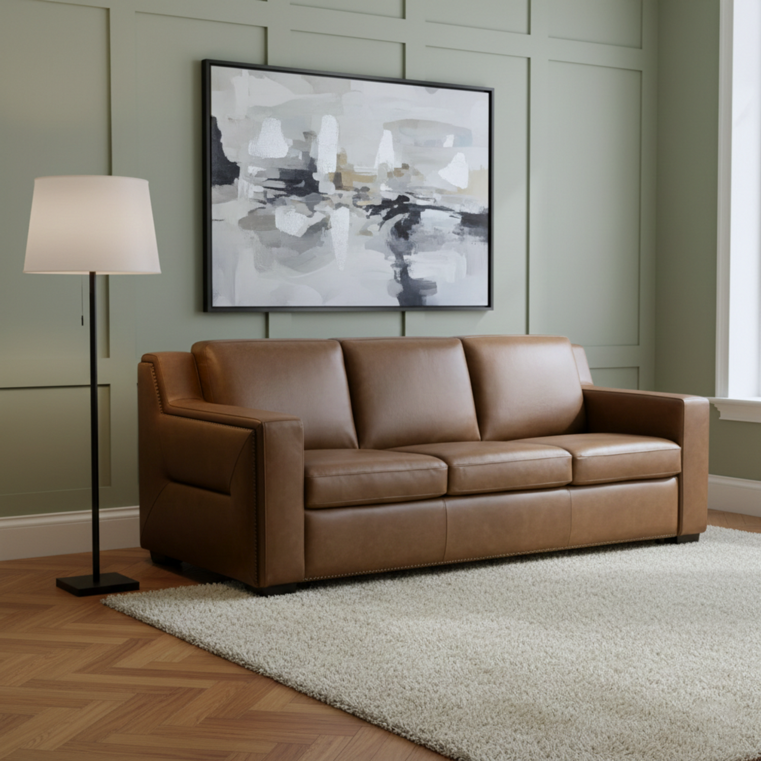 This angle conveys the Alaves as a centerpiece of sophistication, a sofa that doesn’t just blend into décor but elevates it. The image tells the story of timeless elegance, where every detail from the nailhead accents to the smooth leather finish reflects luxury and artistry, making it ideal for upscale interiors.