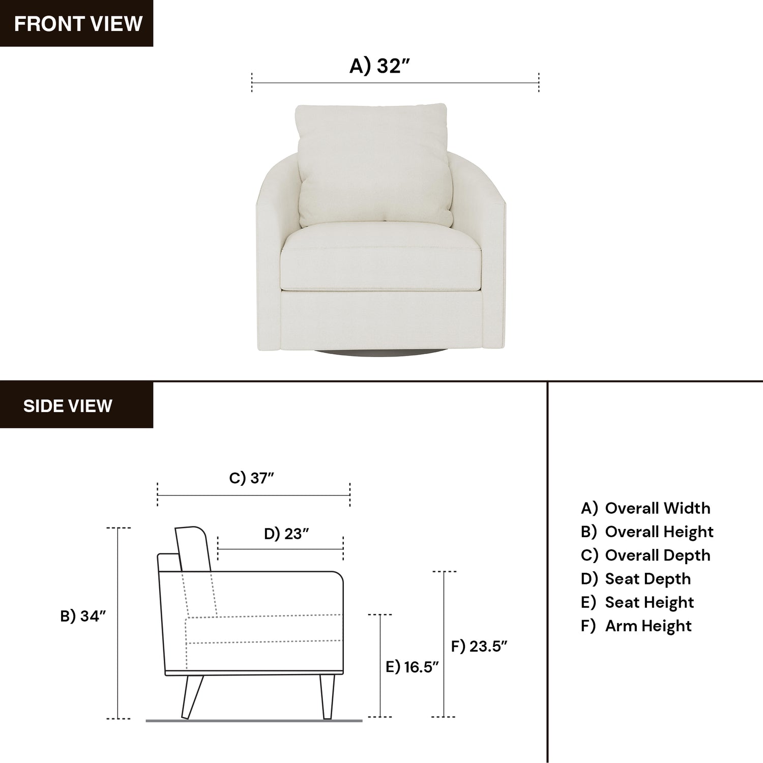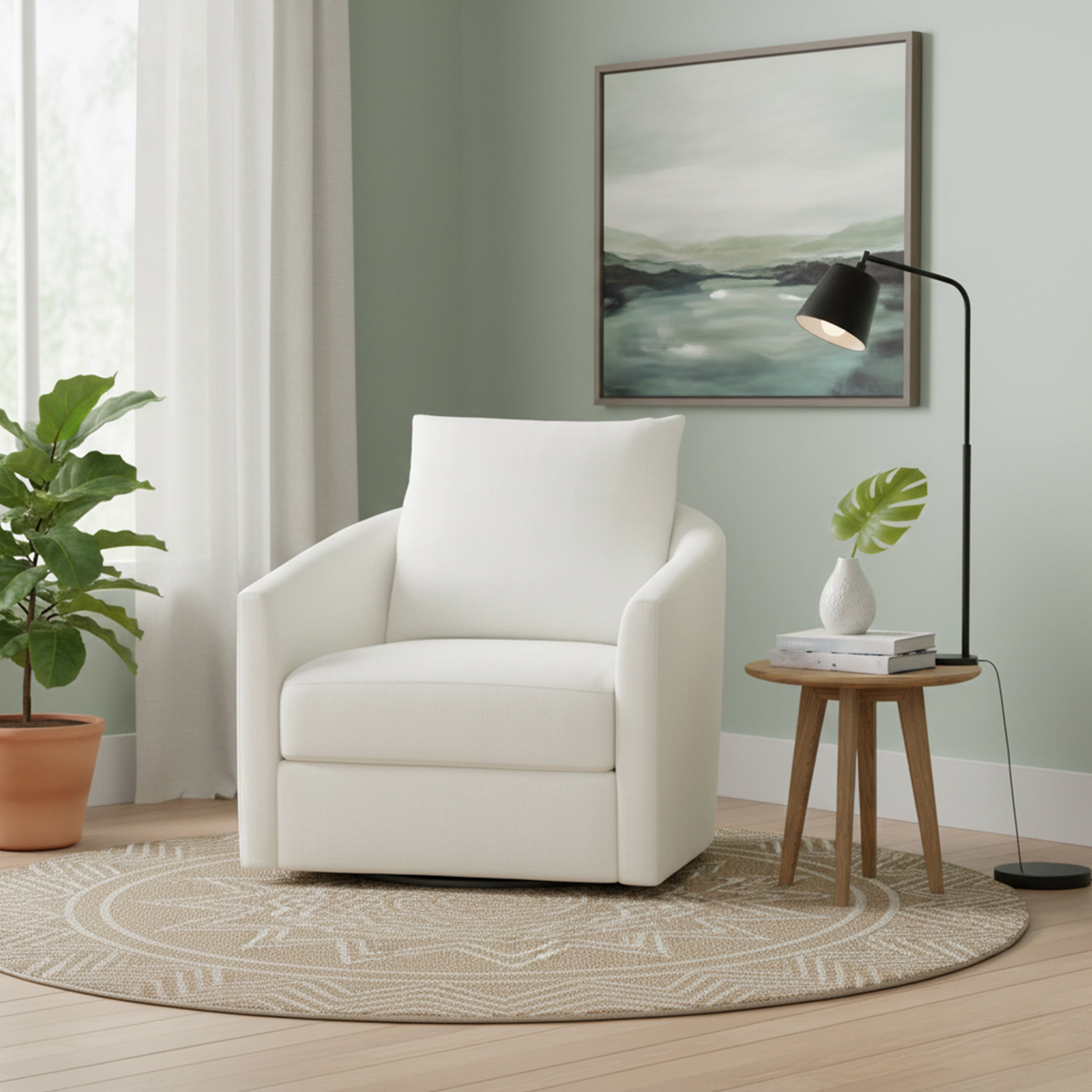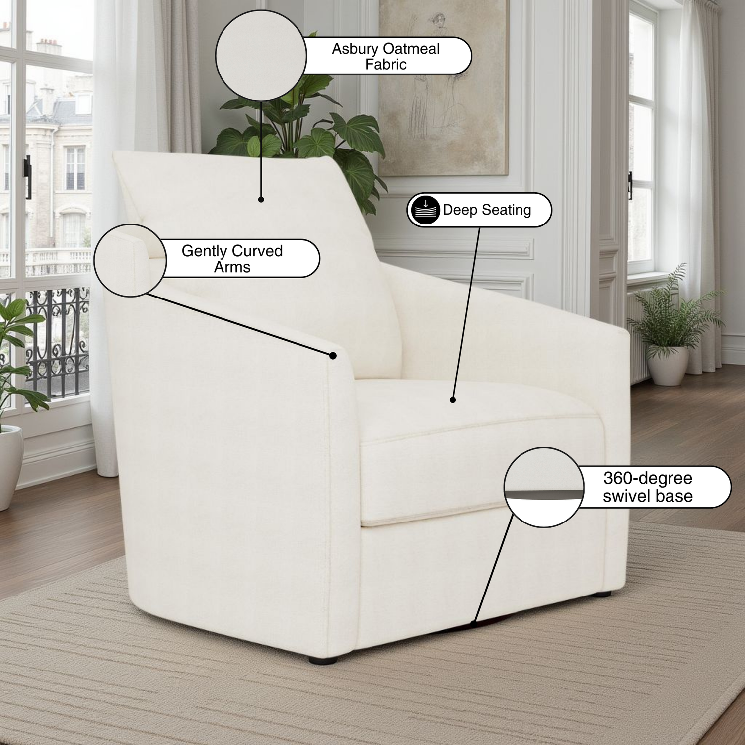 The seat height of 16.5″ provides an easy, comfortable place to sit and stand, while the arm height of 23.5″ supports relaxed lounging that feels natural and inviting. Whether you’re turning toward a conversation or slowly shifting toward the morning light, the balanced scale and smooth swivel make this chair feel like it’s truly part of your home.