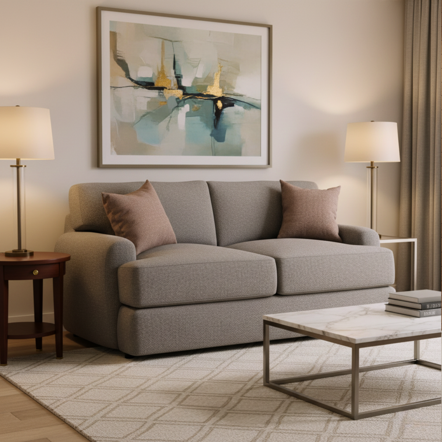 Upholstered in soft fabric and accented with stylish throw pillows, this loveseat blends beautifully with both modern and transitional décor. The deep seating and supportive cushions make it perfect for quiet evenings, casual conversations, or weekend lounging. With its timeless charm and cozy appeal, the Cameron loveseat easily becomes the heart of your living room.