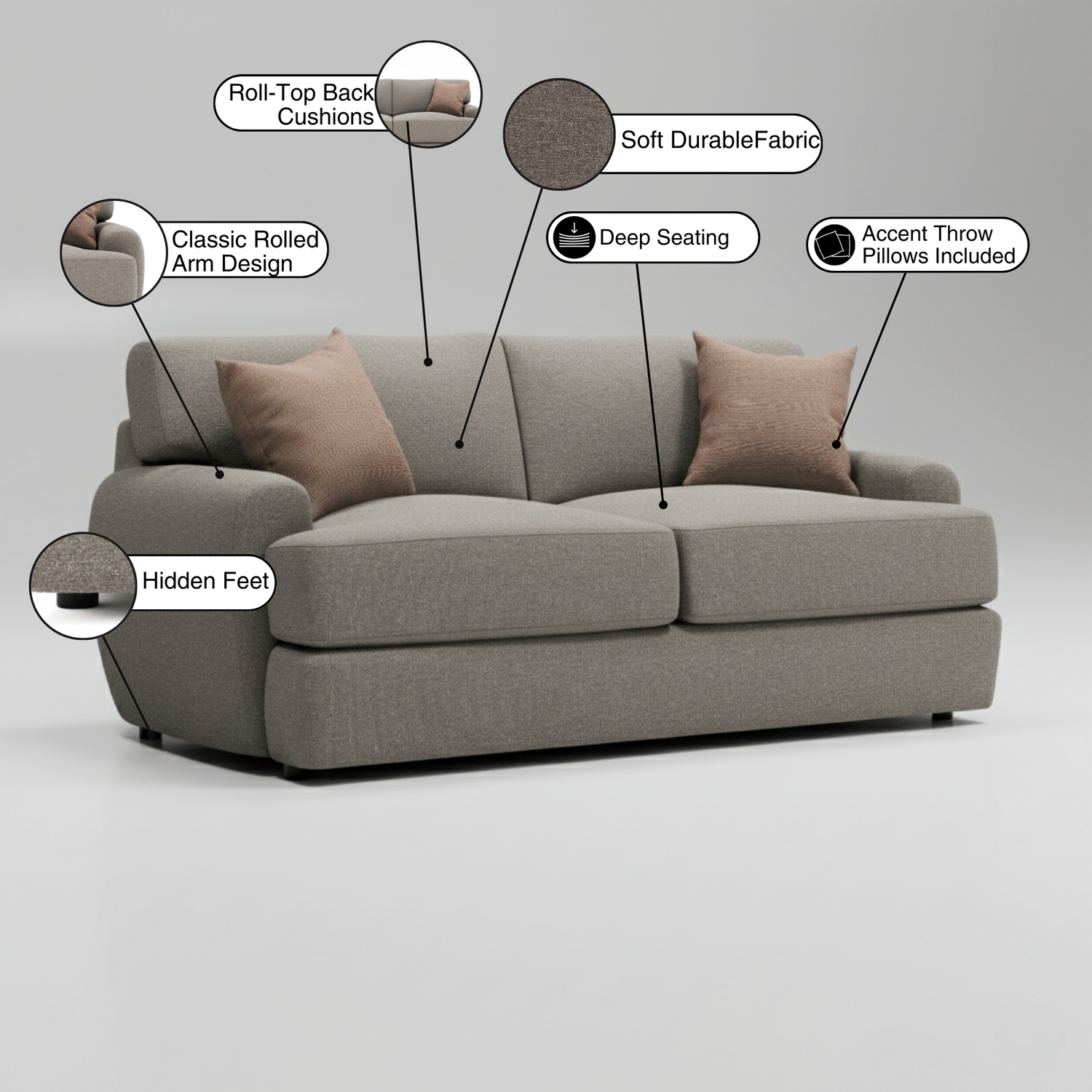 - Classic Rolled Arm Design Oversized rolled arms create a timeless silhouette while offering comfortable arm support for this elegant loveseat.