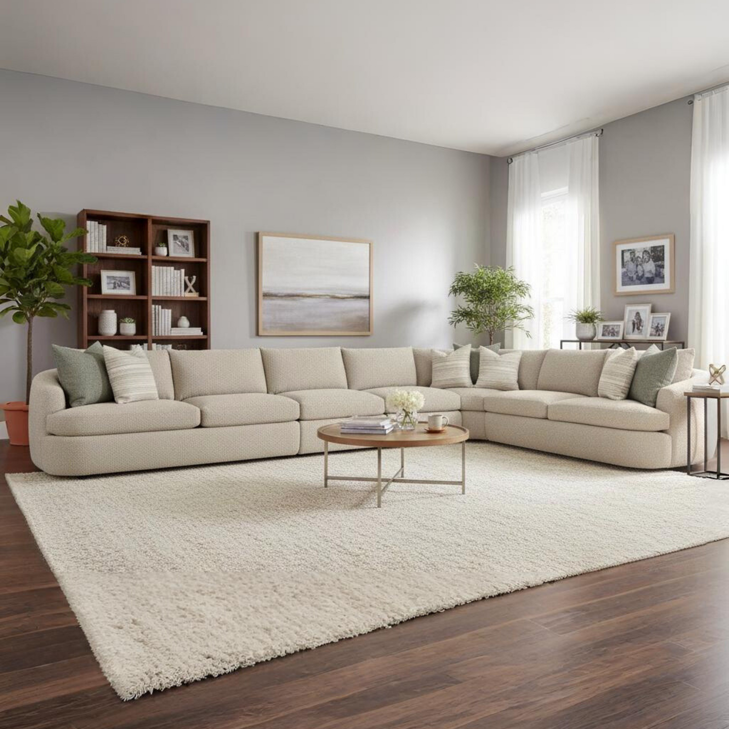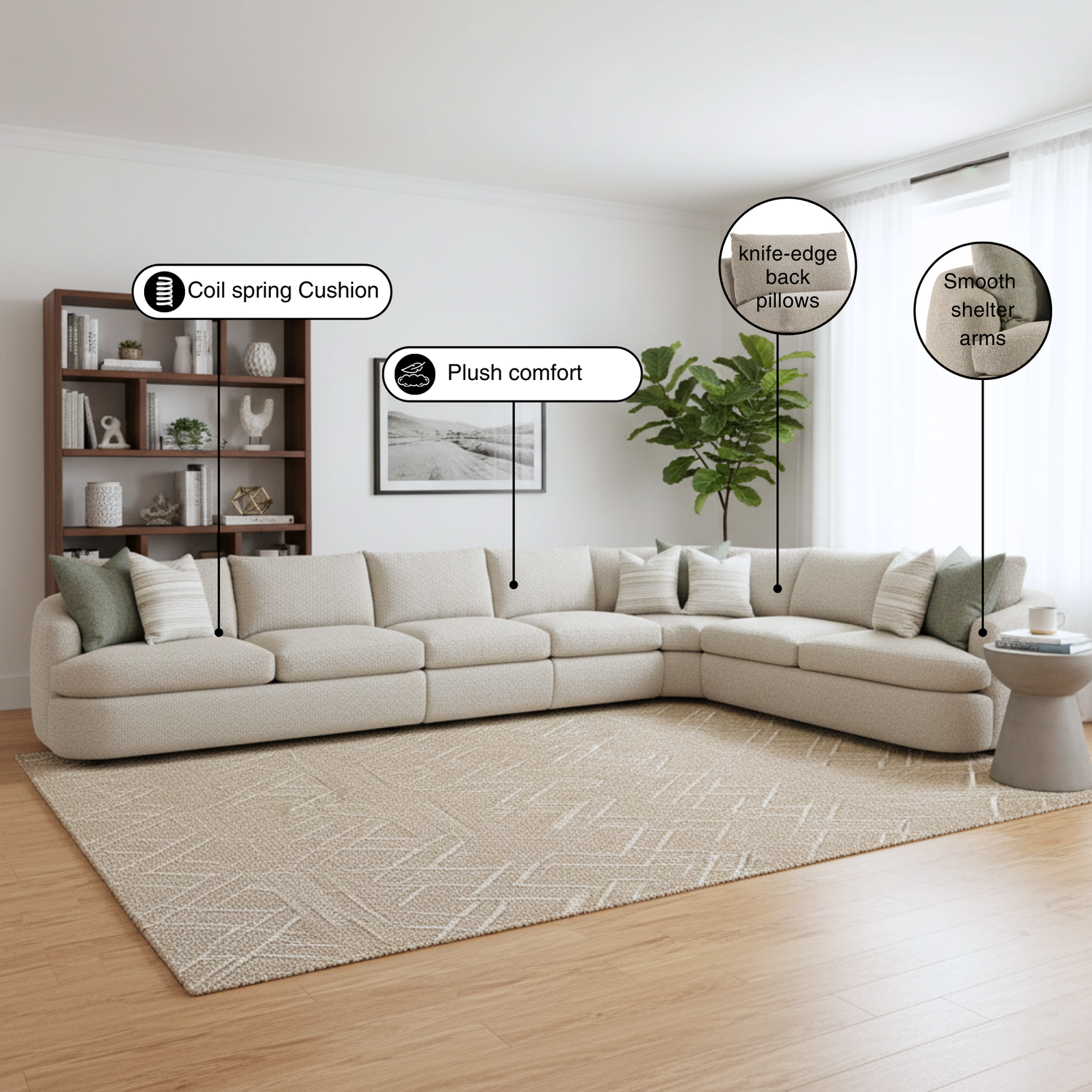 Upholstered in soft neutral fabric, it blends effortlessly with contemporary or transitional décor. Finished with seven coordinating throw pillows, this sectional elevates both comfort and style. With its generous scale, refined craftsmanship, and timeless design, the Jules sectional offers a perfect balance of modern elegance and inviting relaxation.