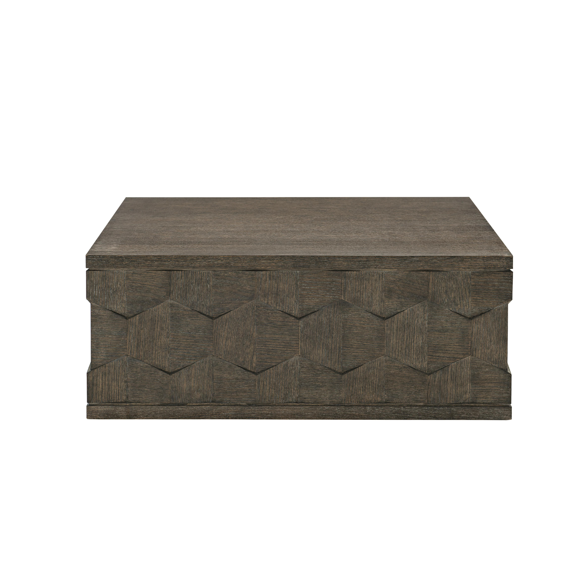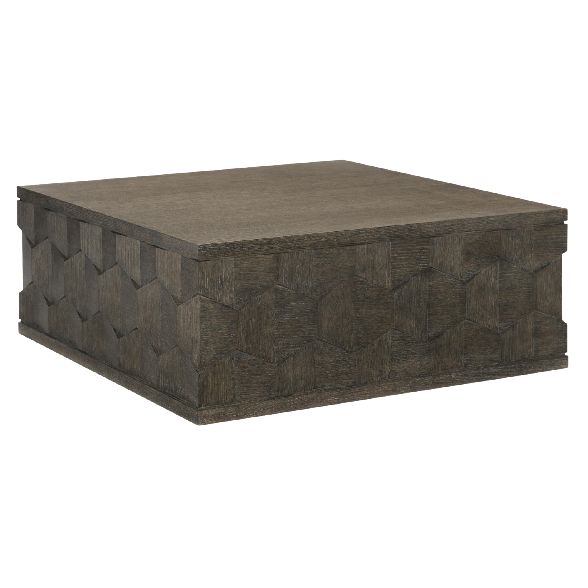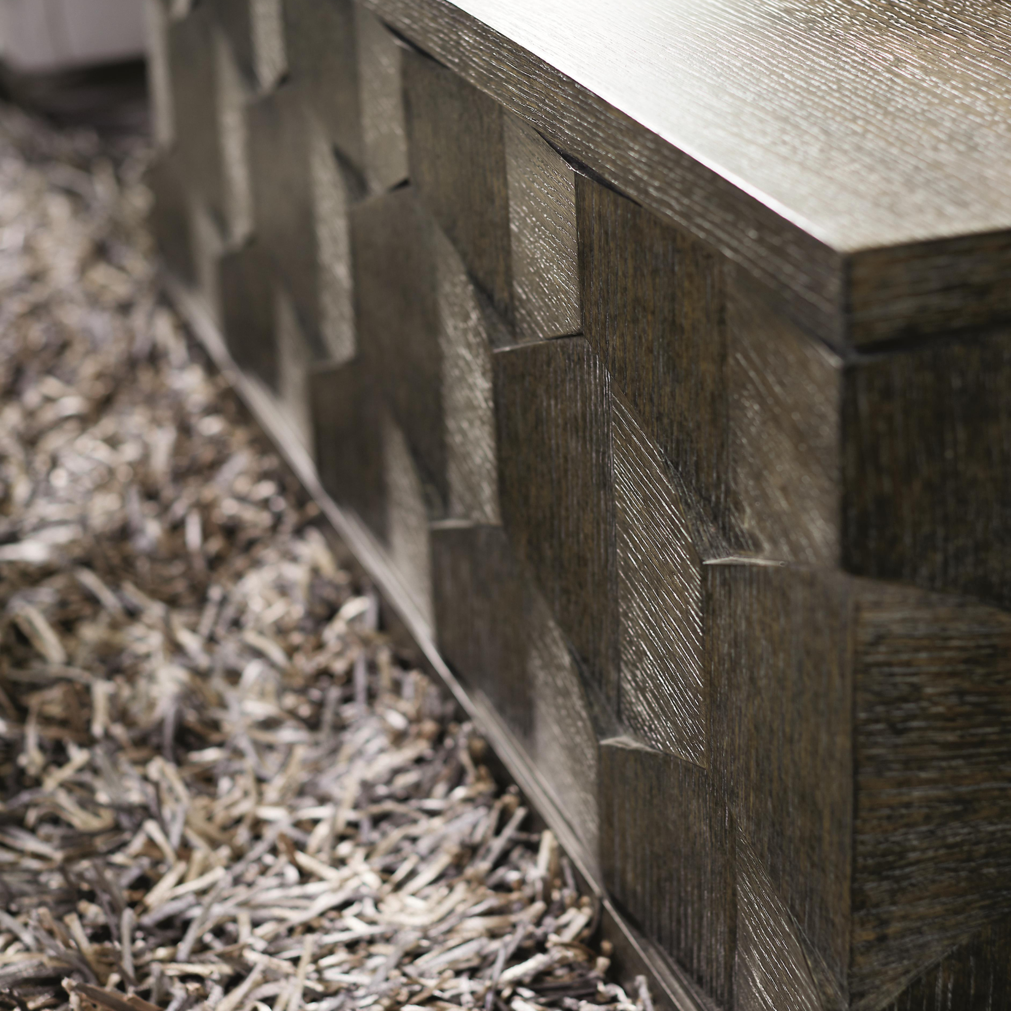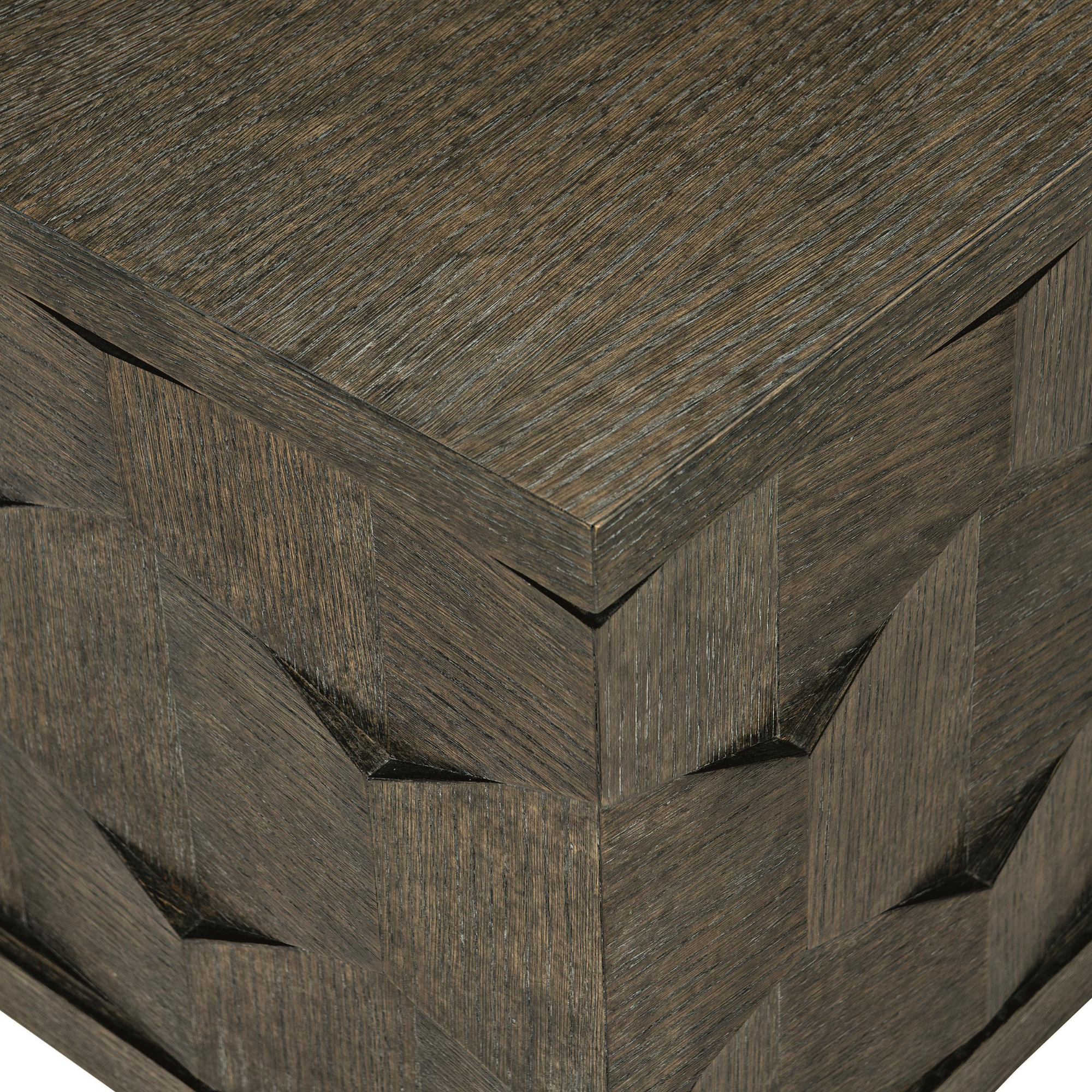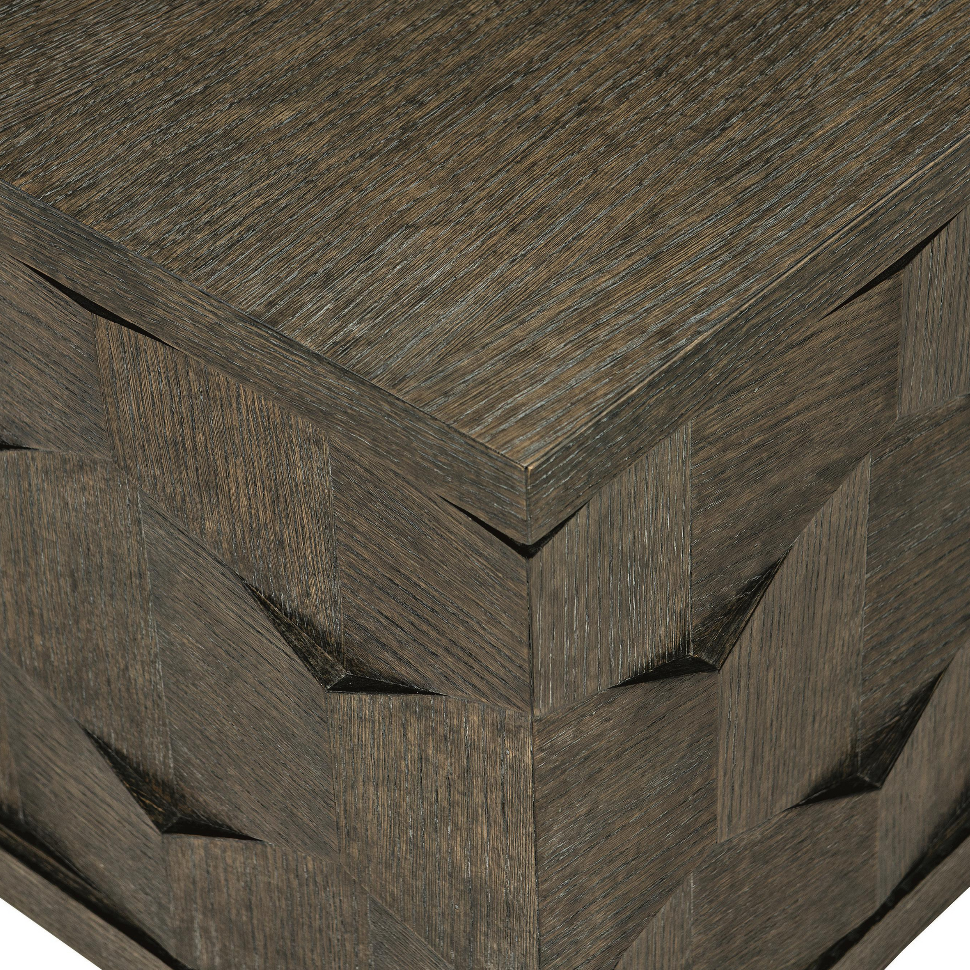Experience the beauty of the Bernhardt Linea Cocktail Table in stunning detail. The close-up view reveals the wire-brushed oak veneers, expertly finished in rich Cerused Charcoal. This unique treatment enhances the natural wood grain while adding subtle texture for a rustic yet refined look.