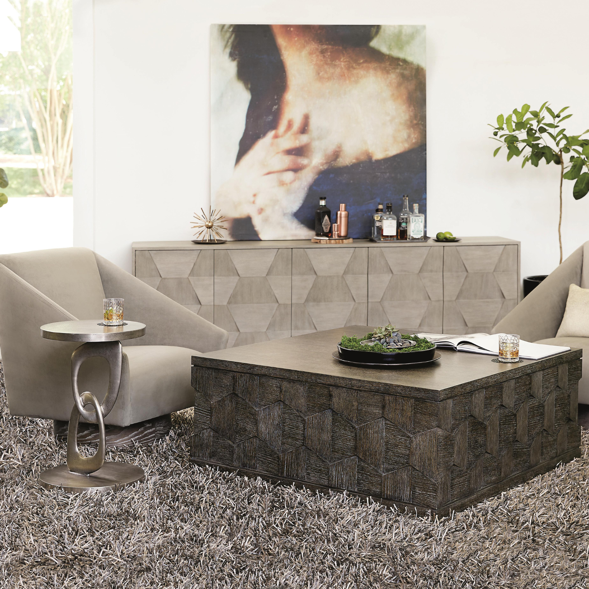 See how the Bernhardt Linea Cocktail Table transforms a living room. Placed in a modern rustic setting, it becomes the perfect centerpiece pairing effortlessly with neutral sofas, cozy accents, and warm lighting.
