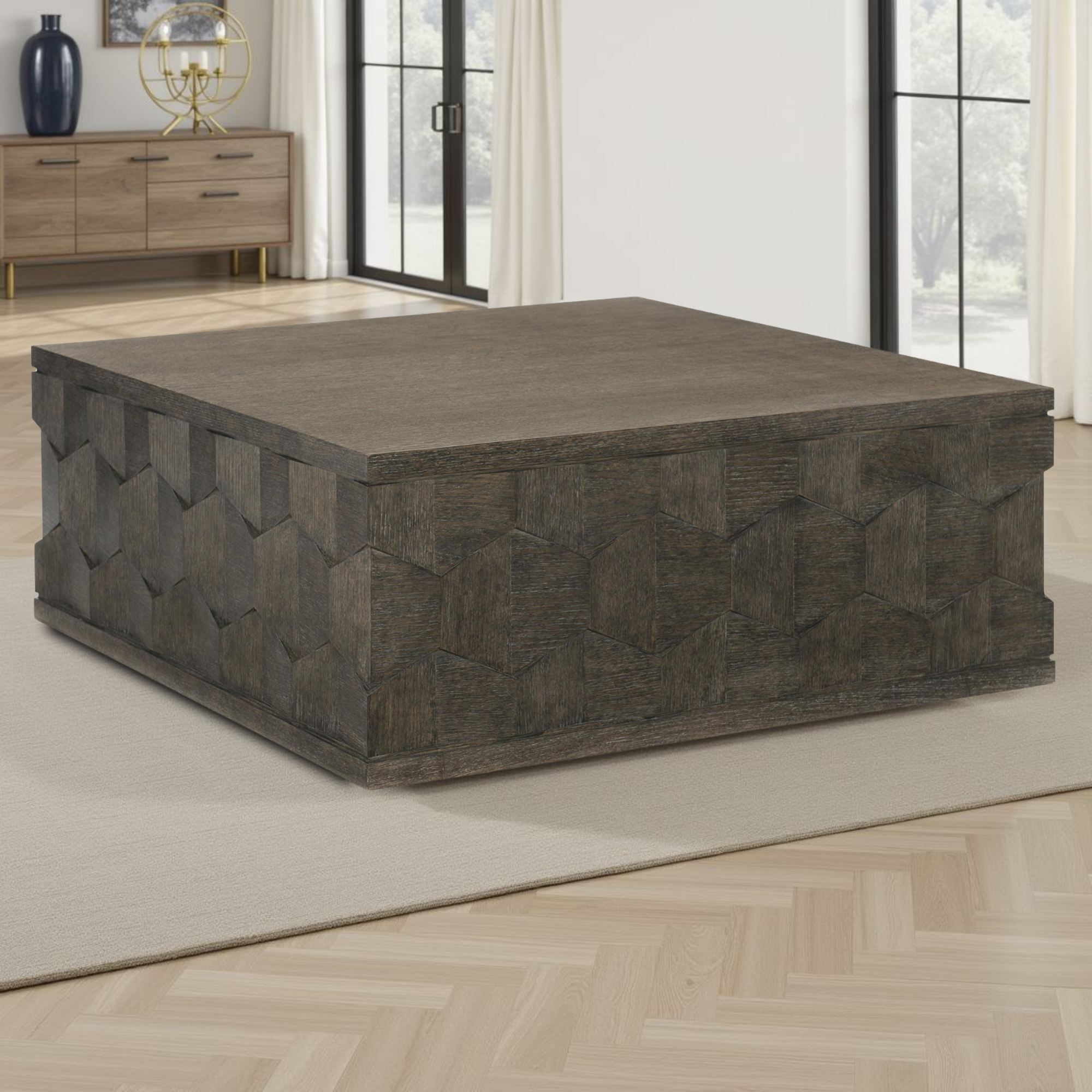 The geometric, faceted veneer design catches the light from every angle, creating visual depth and character. These detailed shots help you appreciate the artistry and quality that make this table a standout piece for your home.