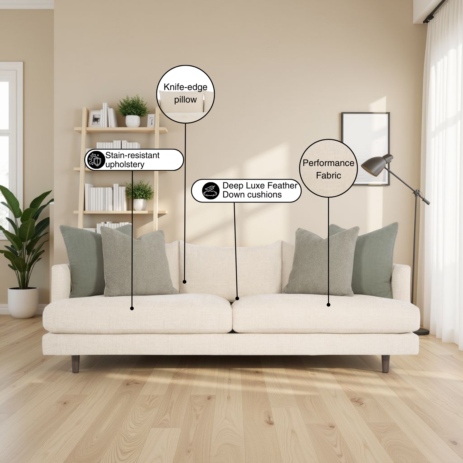 Deep seating with plush Luxe Feather Down cushions and three loose fiber back pillows ensure every moment of lounging feels lush and supportive. ThorntonFurniture+2Yaletown Interiors+2 The upholstery’s quality fabric, paired with tapered round wooden legs offered in various finishes adds refinement and allows personalization to suit your decor.