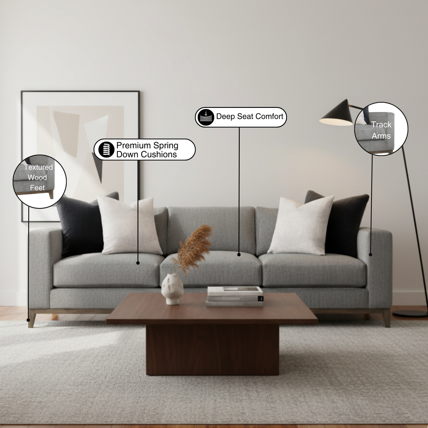 The plush Blendown cushions offer the perfect balance of support and softness, while the track arms and elegant tapered legs create a sleek, modern silhouette. The natural fabric tone blends effortlessly into any home aesthetic, whether you're styling a contemporary apartment or a cozy family space.