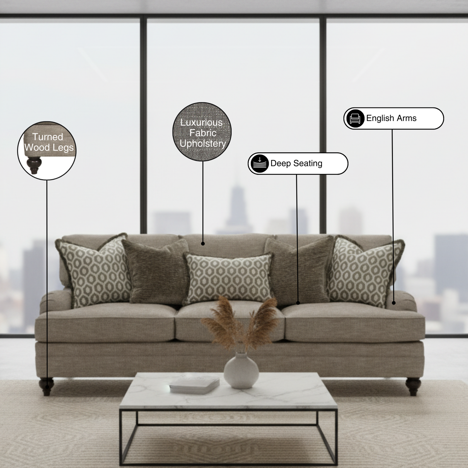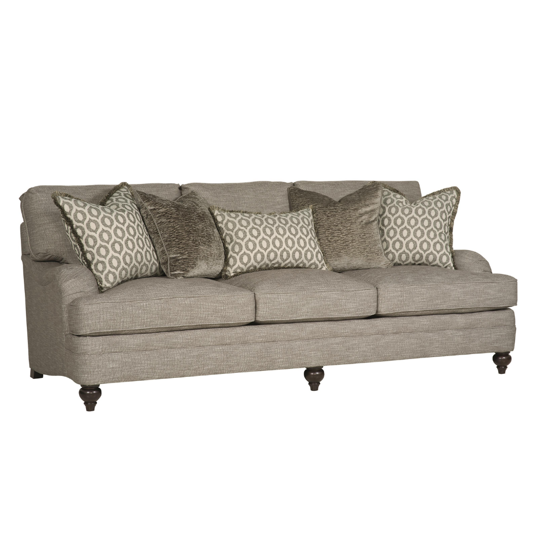 Step into timeless elegance with the Bernhardt Tarleton Sofa where classic design meets today’s comfort. Inspired by traditional craftsmanship, this piece is the heart of a refined living room, wrapped in rich brown upholstery and detailed with a knife-edge blendown cushion finish.