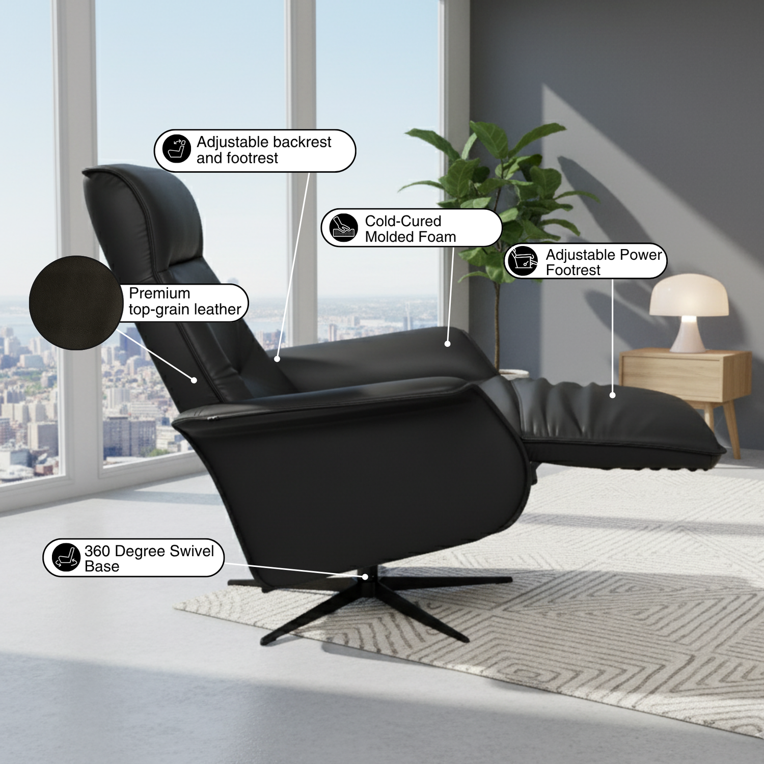 The Fjords Finn Leather Swivel Glider Power Recliner defines modern luxury with timeless Scandinavian craftsmanship. Upholstered in premium top-grain leather, it exudes sophistication while providing lasting durability. The dual-motor power system allows independent backrest and footrest control, ensuring personalized comfort at every angle. Its 360° swivel glider base offers smooth rotation and gentle rocking, while the adjustable headrest supports your neck perfectly.