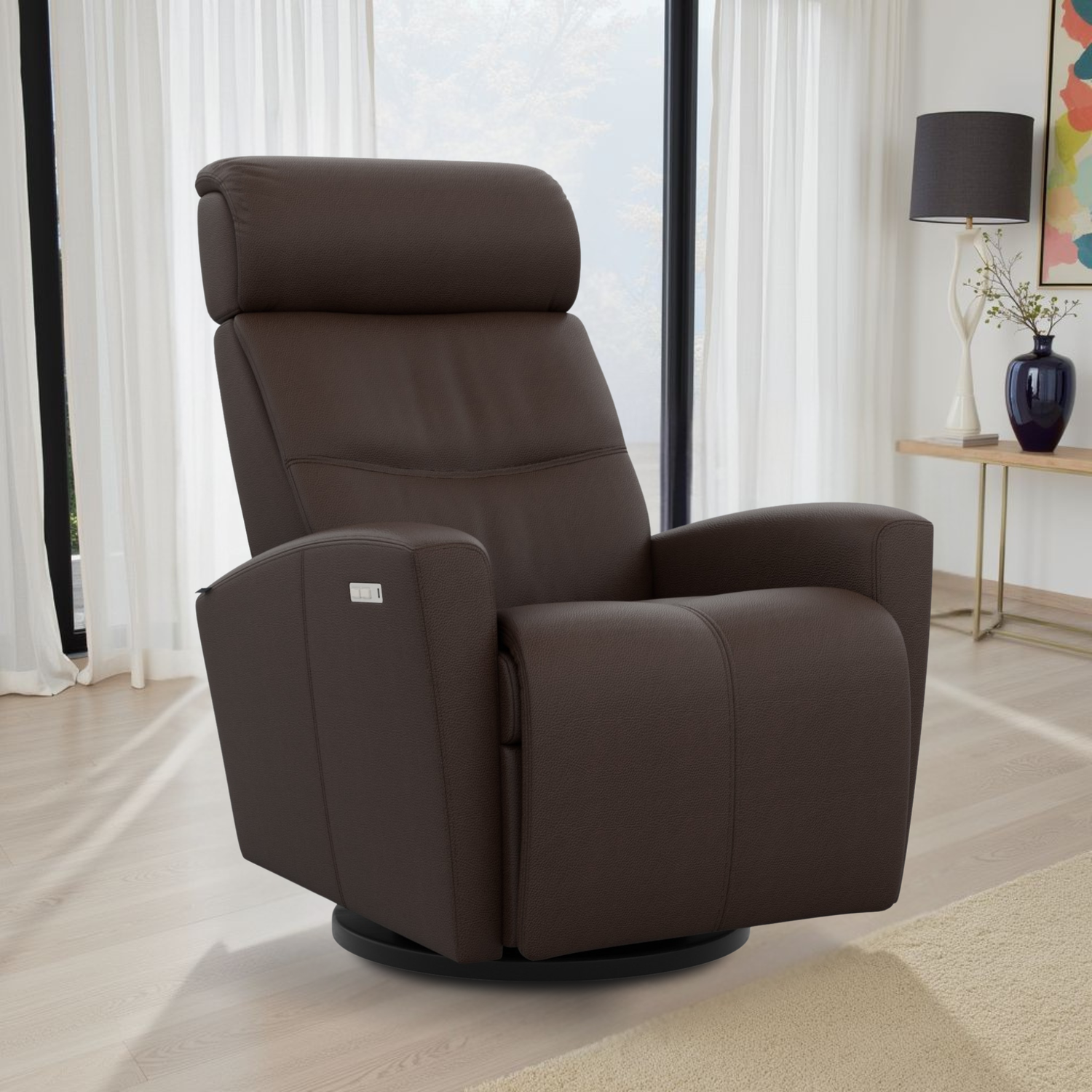 The Fjords Milan Leather Swivel Glider Power Recliner Chair epitomizes luxury with its impeccable craftsmanship and high-end materials. Upholstered in premium top-grain leather, the chair offers a rich, tactile experience that is both durable and breathable, ensuring it retains its beauty over time. The motorized headrest and articulating head support provide personalized comfort, allowing you to adjust the chair’s position for ideal neck and lumbar support.