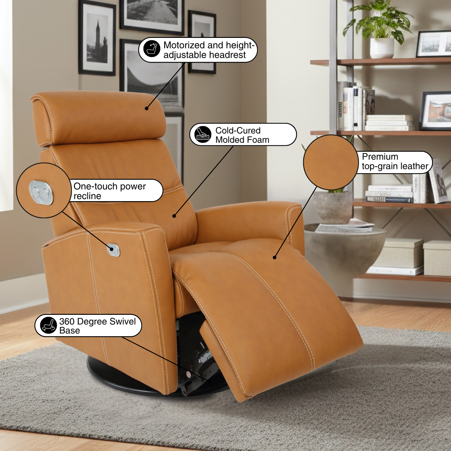The cold-cured molded foam ensures long-lasting comfort and shape retention, making each seating experience feel like the first. With a swivel base, glide/rocker motion, and one-touch power recline, the chair offers smooth, effortless movement. A height-adjustable headrest adds an extra layer of customization, while the sleek, modern design and ergonomic lumbar support make this recliner the perfect blend of function, comfort, and style for any luxurious living space.
