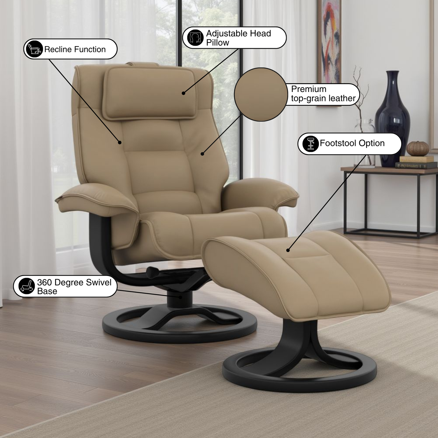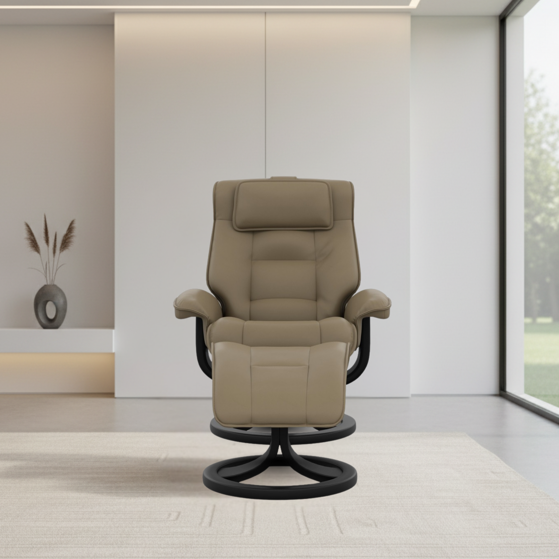 This recliner is the perfect blend of modern style and classic comfort. The wood finish is stunning, and the taupe leather I chose fits seamlessly with my décor. The separate footstool is a great touch for added relaxation.