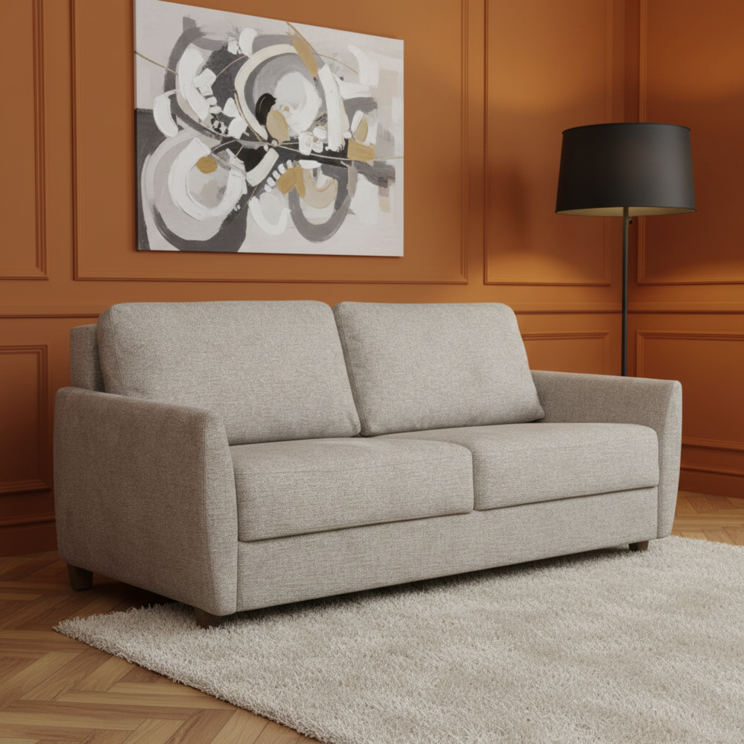 The Sonja Sleeper Sofa is styled in a Scandinavian living room, upholstered in fabric with high‑resilience foam and PES fiber padding. Its low‑profile silhouette, clean lines, and tailored proportions for Queen and XL are highlighted with warm lighting, emphasizing its refined Nordic appeal. This image conveys Sonja as a versatile centerpiece that blends timeless design with everyday practicality.