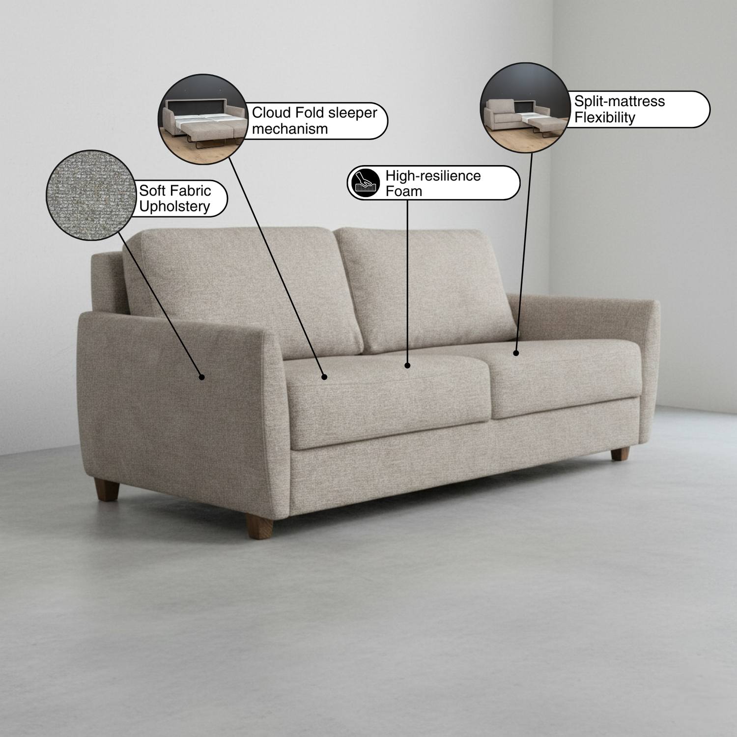 The Cloud Fold sleeper mechanism in action, with the sofa smoothly unfolding into a bed with an open depth of 82.5". The fully upholstered mattress is styled with crisp bedding, reinforcing its practicality for overnight guests. High‑resilience foam and no‑sag springs are shown in detail, emphasizing lasting comfort.