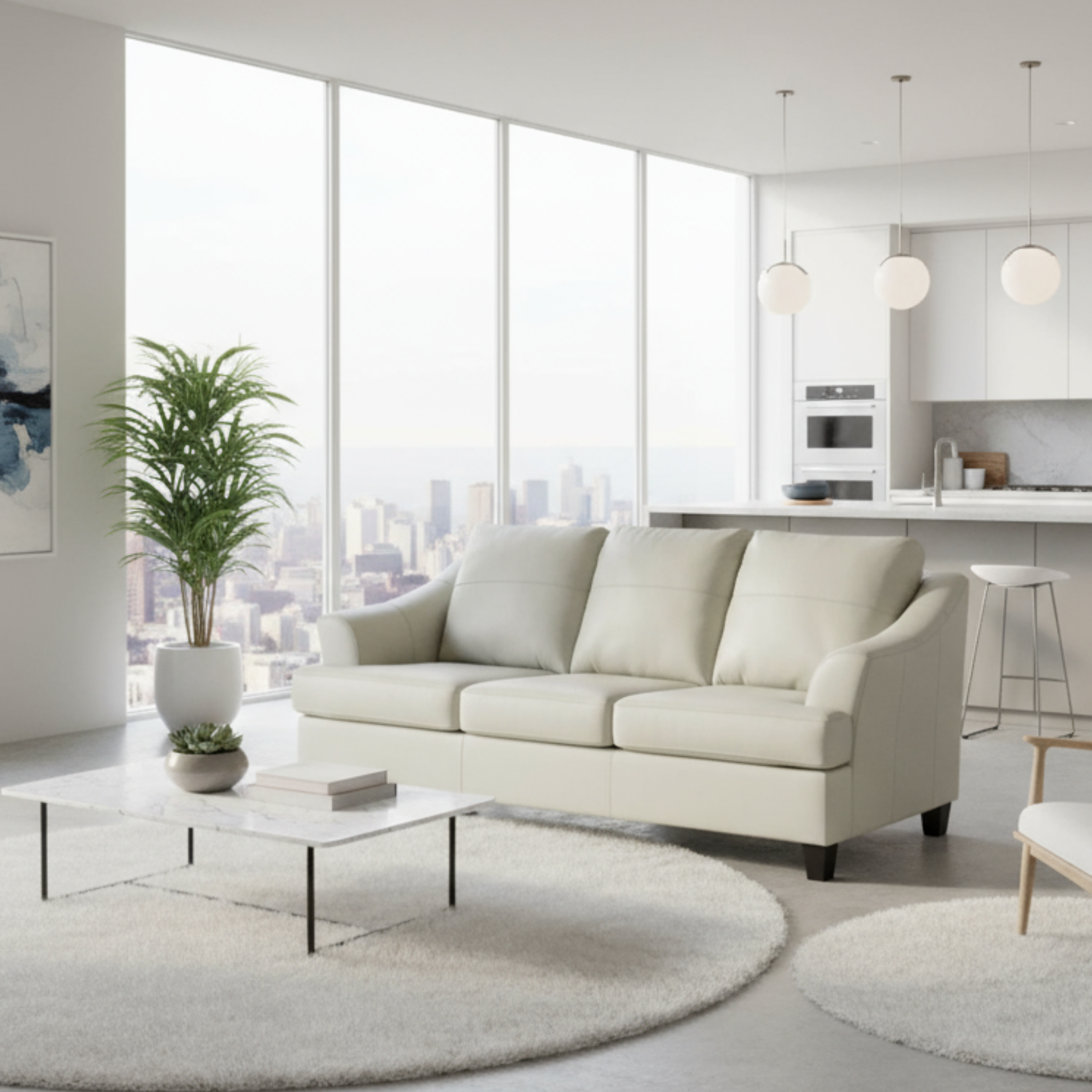 The Geneva 3‑Seater brings an easy elegance to living spaces, with genuine leather where you lounge and a clean, tailored silhouette that balances modern lines with timeless warmth. Styled beside a soft rug and warm lamplight, its chocolate‑finished feet and neutral tones blend effortlessly with art, pillows, and woods you already love, creating a room that feels welcoming from the first glance.​