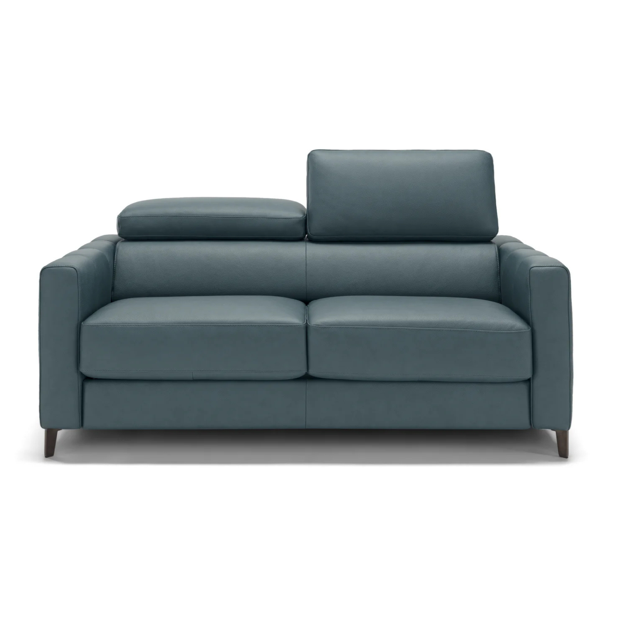 The Avelina Sleeper Sofa is styled in a contemporary living room, upholstered in smooth premium leather. Its clean, tailored silhouette and 4‑inch metal legs are highlighted with soft lighting, creating an airy, modern presence. This image conveys Avelina as a refined centerpiece that blends Italian craftsmanship with effortless sophistication.