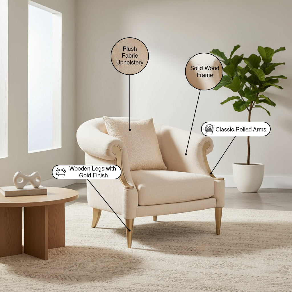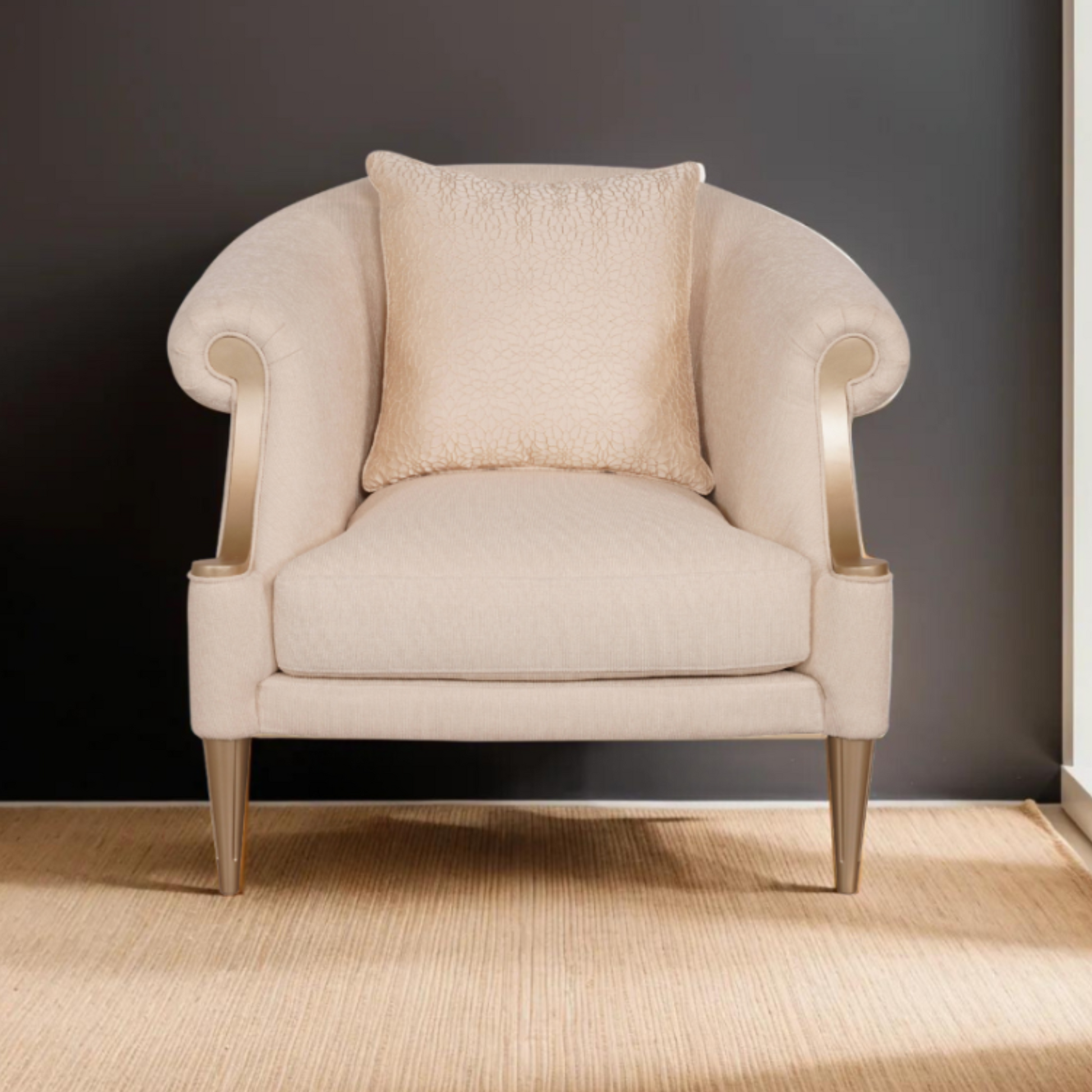 Some pieces don't just fill a space they transform it. The Clarkson armchair is that kind of presence. With its gracefully rolled arms and soft beige upholstery, this chair becomes your all-day haven.