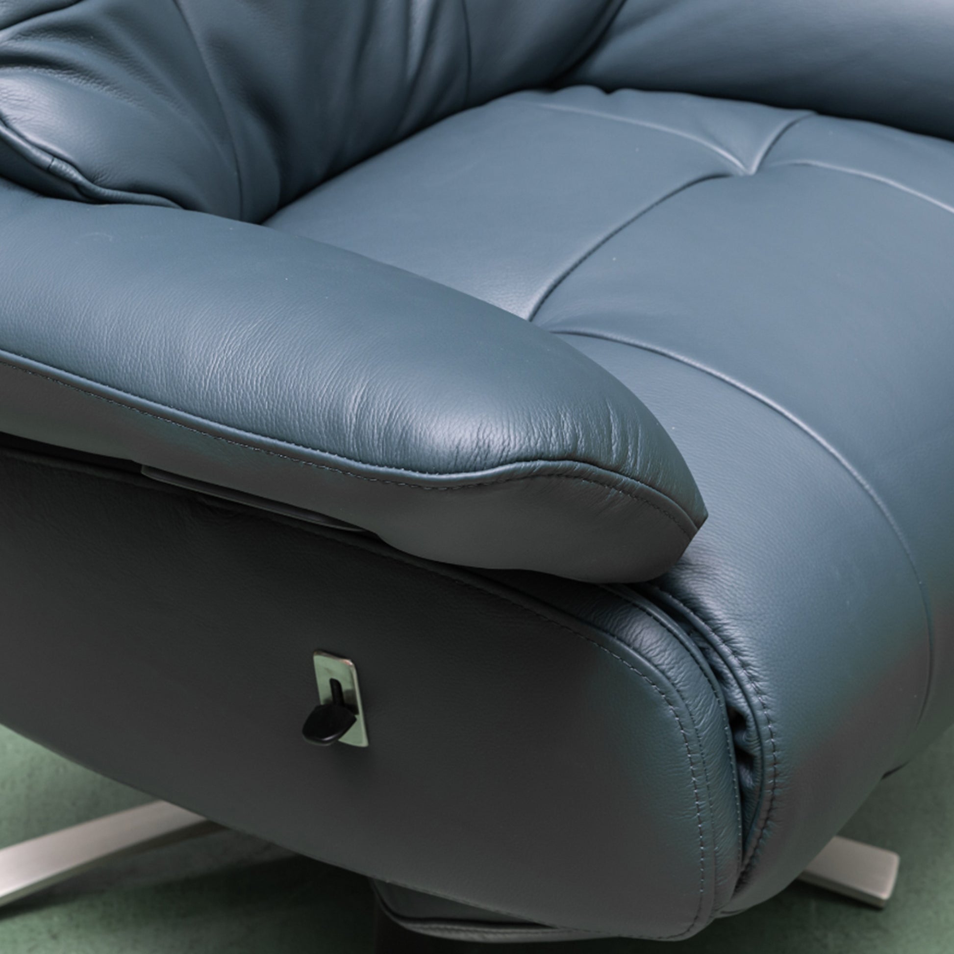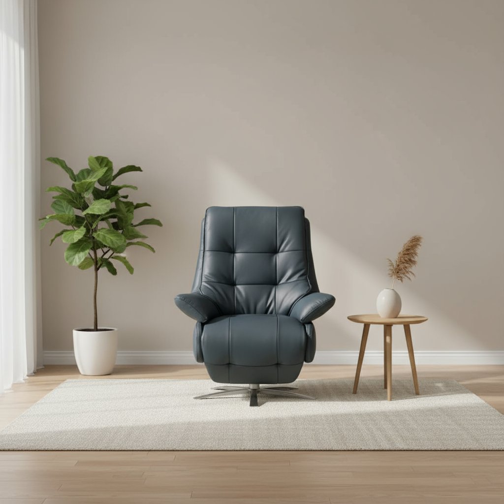 The Recliner is wrapped in luxurious A4 full leather in a sophisticated N195 Blue finish, offering both style and durability. Built with high-density cushions and foam-padded back, it delivers lasting support and plush comfort.