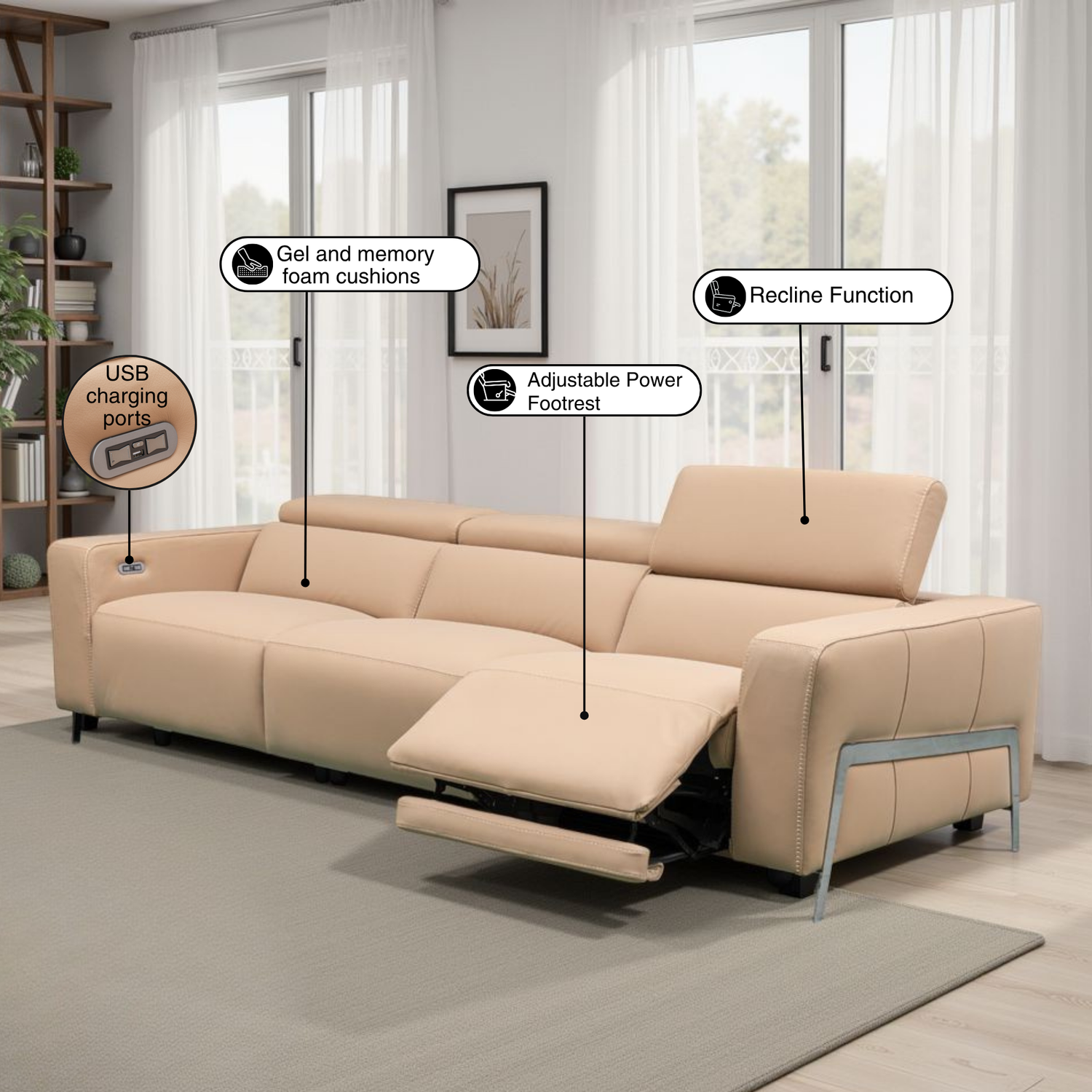 Experience premium comfort with the Prestigio 3-Seater Power Reclining Sofa, designed to bring luxury and functionality to your home. Upholstered in top-grain, stone-washed leather sourced from Brazil and Australia, this sofa delivers a soft, durable, and timeless look. With independent power headrests and footrests, each seat adjusts effortlessly for personalized relaxation, while gel and memory foam cushions provide exceptional support.