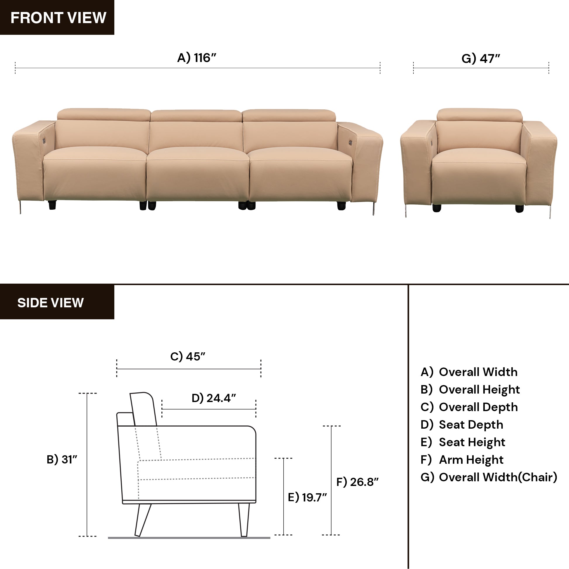 Sleek metal legs add a modern touch, and built-in USB charging ports keep devices powered as you lounge. Perfect for family rooms, media spaces, or upscale living areas, Prestigio combines Italian-inspired design with high-tech convenience. Its plush padded arms, refined stitching, and superior craftsmanship make it as stylish as it is functional. Whether enjoying a movie night or entertaining guests, this sofa offers a seamless blend of elegance, comfort, and durability, built to elevate your lifestyle.