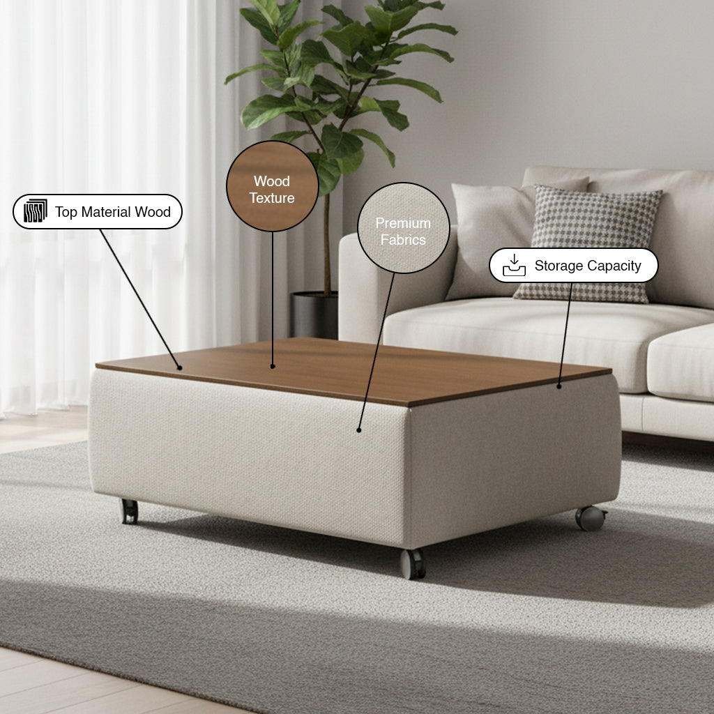 The lift-top mechanism glides open with ease, revealing a spacious compartment for storage. Available in multiple fabric options, it’s a smart blend of beauty, comfort, and convenience crafted to make everyday living easier and more enjoyable.