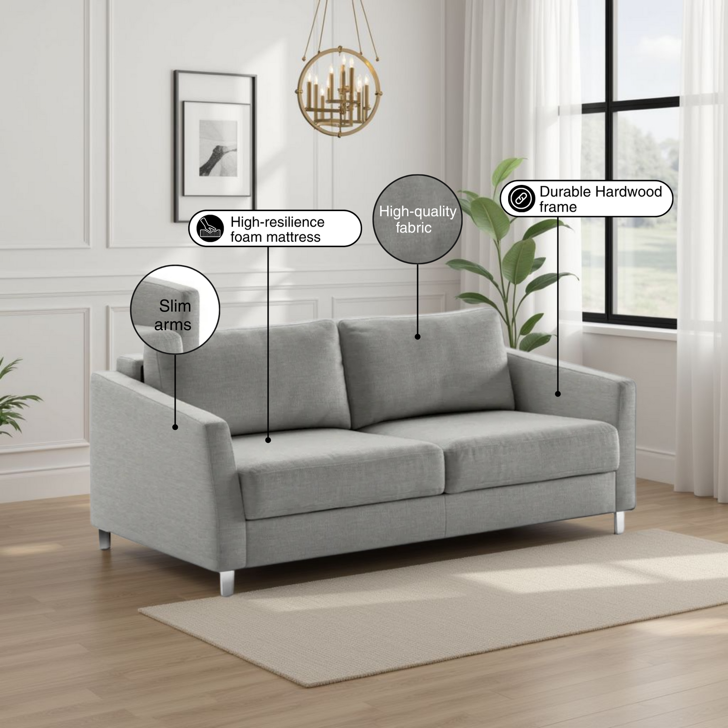 Monika features Luonto’s Nest dual-motion mechanism, allowing it to transform smoothly into a plush queen-size bed without cushion removal. The 5-inch high-resilience foam mattress ensures lasting comfort for both lounging and overnight guests. With clean lines, narrow arms, and premium finishes, Monika makes a stylish centerpiece for modern living rooms, apartments, and studios sustainably built to last for years of everyday enjoyment.
