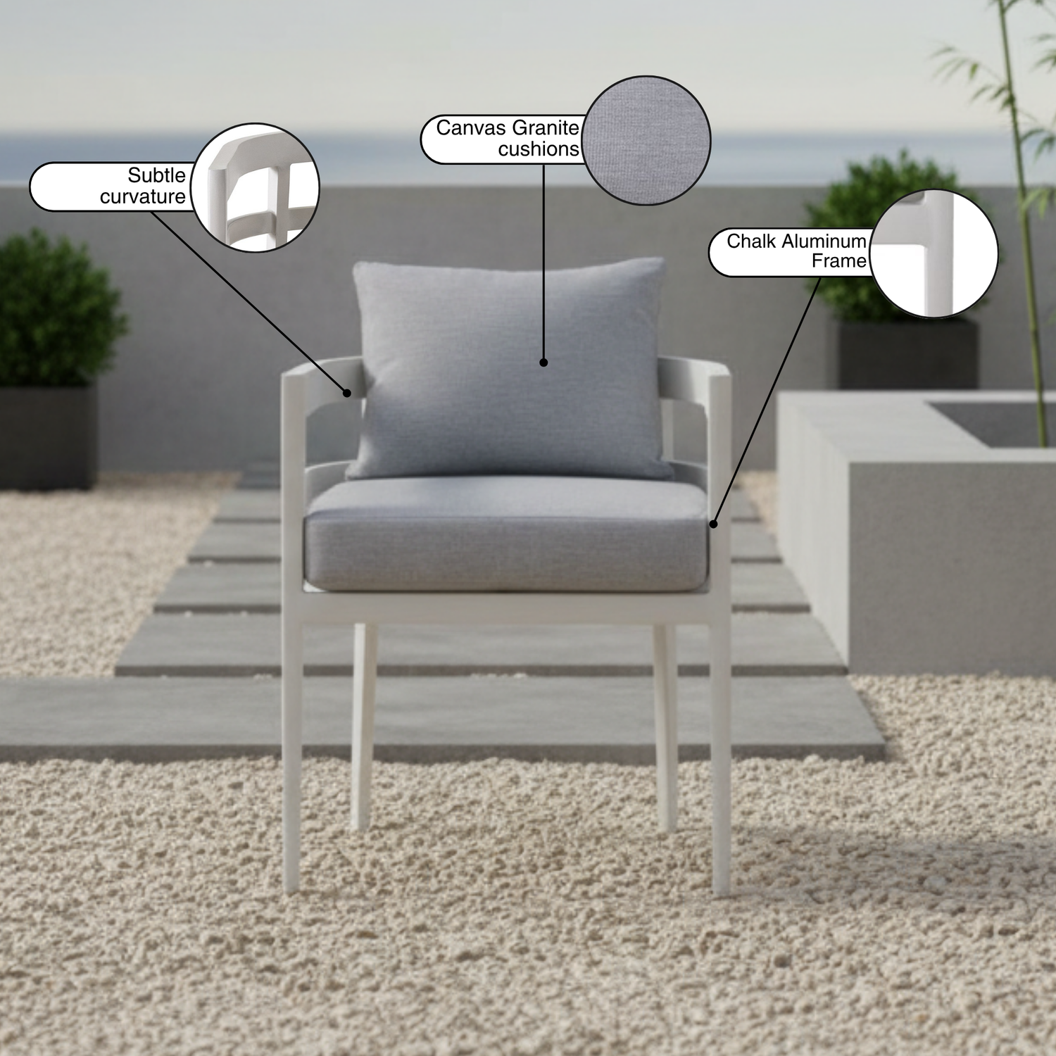 Gracefully crafted with refined coastal charm, the South Beach Dining Chair blends casual elegance with everyday comfort. Its soft Canvas Granite cushions, crisp Chalk aluminum frame, and gentle curvature create a look that feels both stylish and inviting. Thoughtful proportions at 23W × 23D × 32H make it easy to visualize in your home, adding a touch of airy sophistication to any dining space.