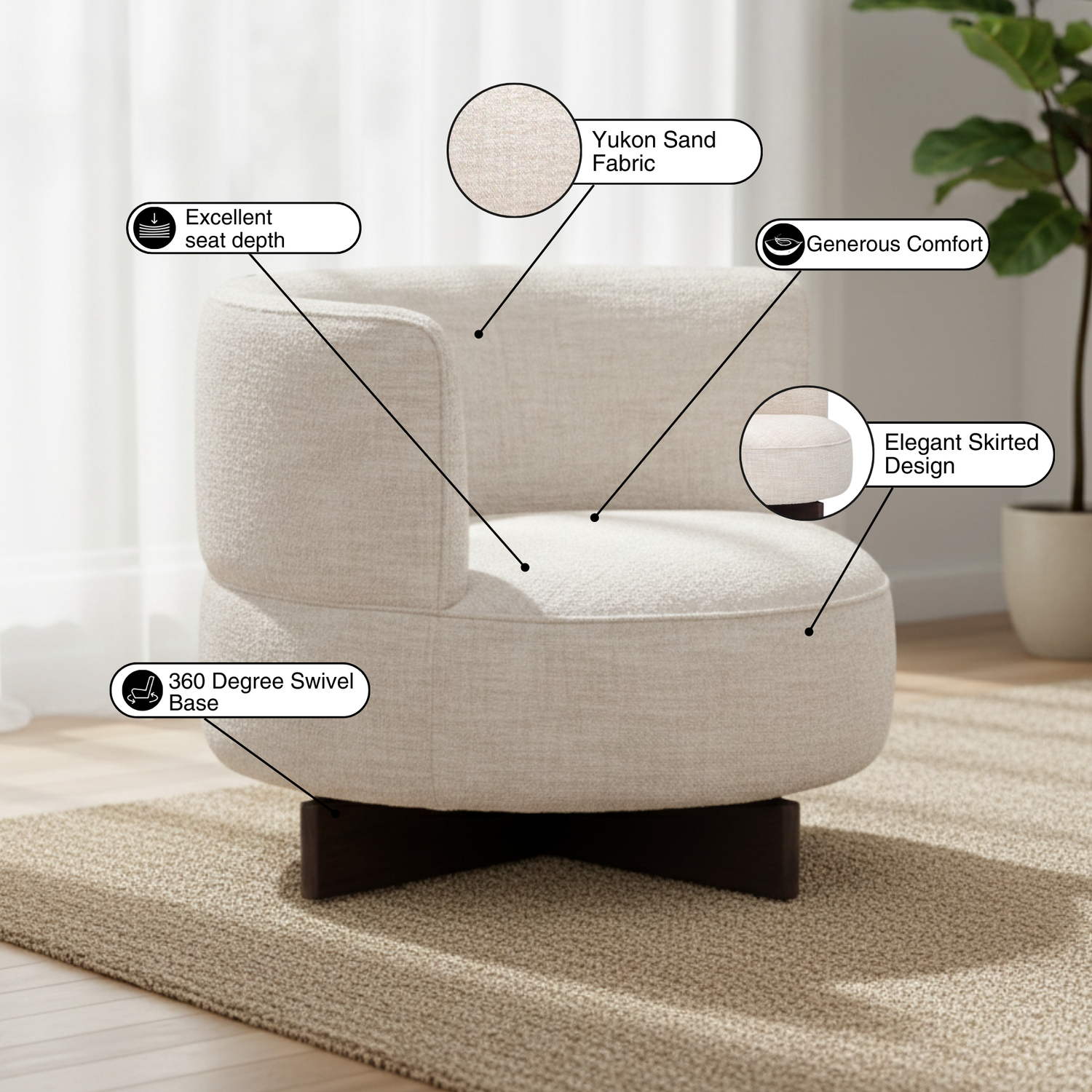 In this visual, the 360-degree swivel function takes center stage, showing how fluidly the chair rotates while maintaining its elegant, grounded posture. The image captures the effortless motion that makes the Yukon Sand Swivel Chair perfect for multitasking, whether engaging in conversation, turning toward a window, or simply adjusting for comfort. It communicates convenience without compromising sophistication.