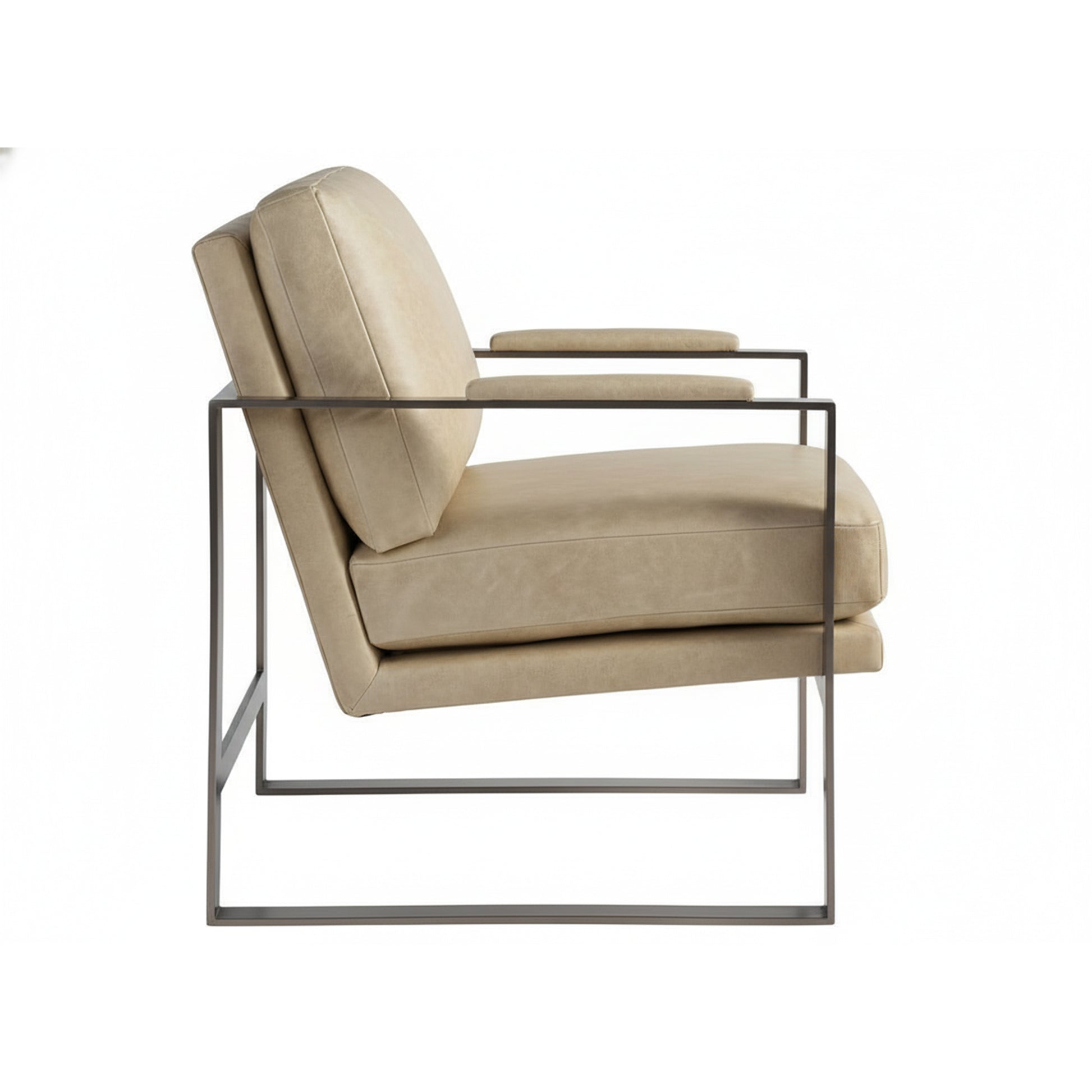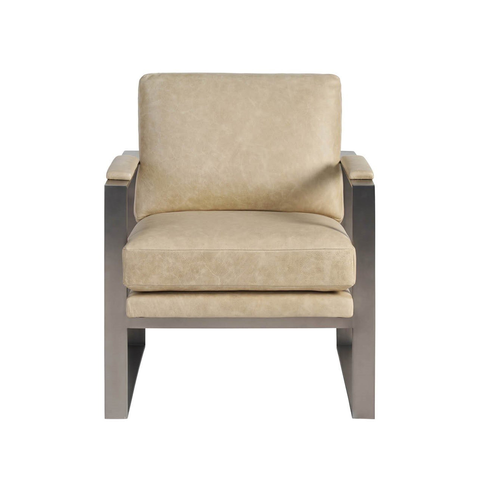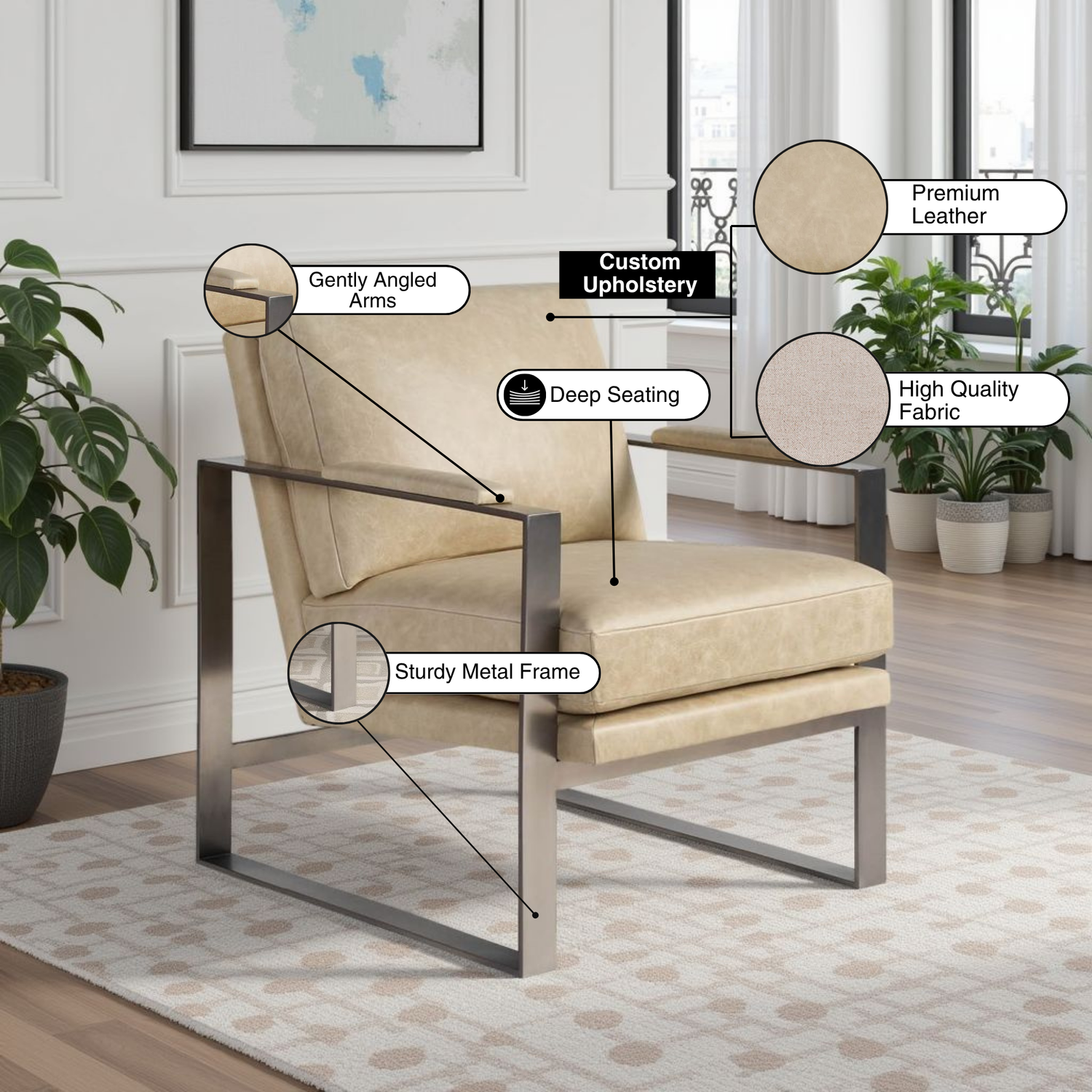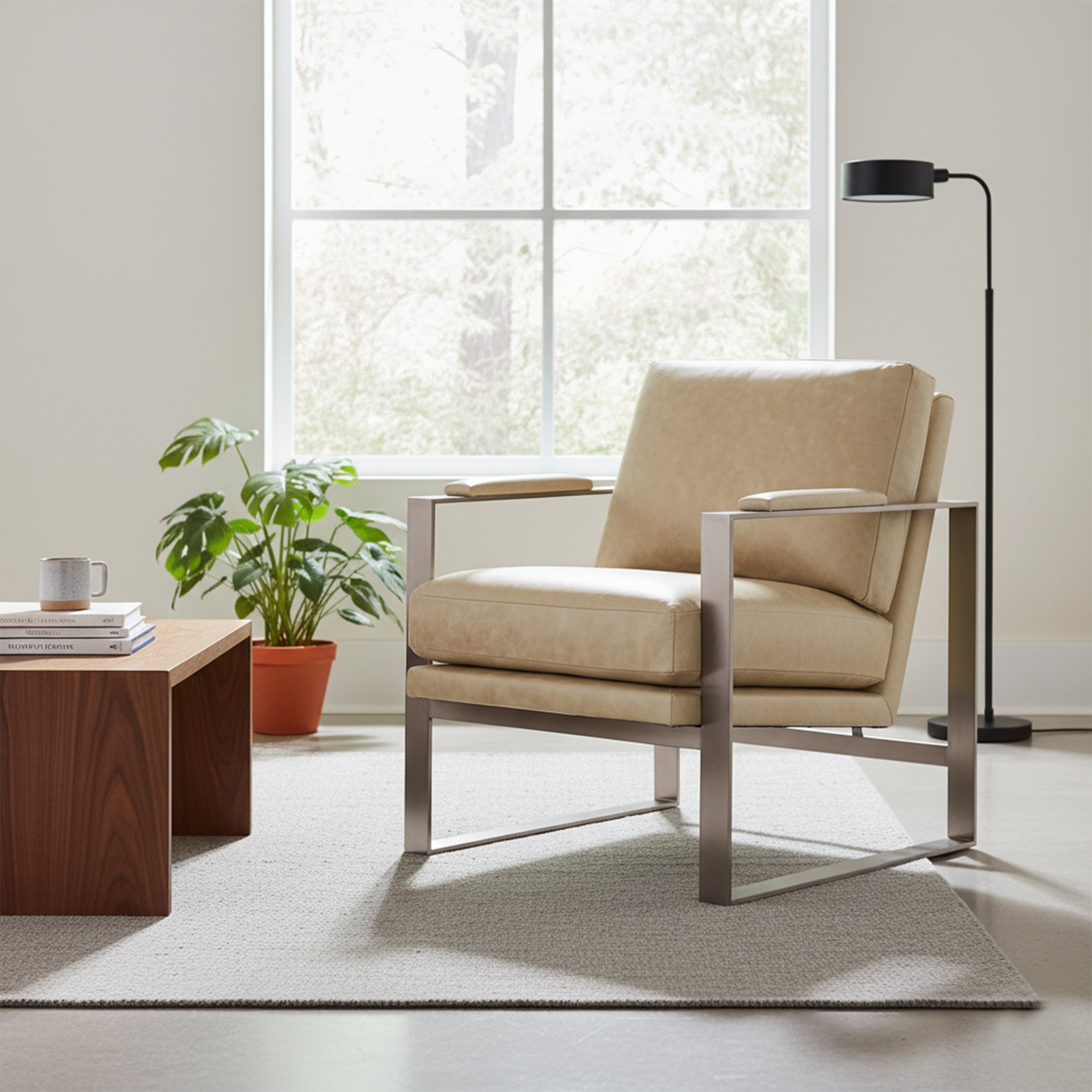 In the features-focused image, the Corbin Accent Chair reveals the thoughtful craftsmanship and comfort-driven design that make it a standout piece in any modern home. Its satin-pewter tubular metal frame offers durability with a refined, architectural look—bringing a touch of understated luxury to contemporary décor. The upholstered seat, available in Nehir Sand leather or a wide range of performance fabrics, provides a plush yet supportive feel, making it ideal for long conversations, reading sessions, or simply relaxing at the end of the day.