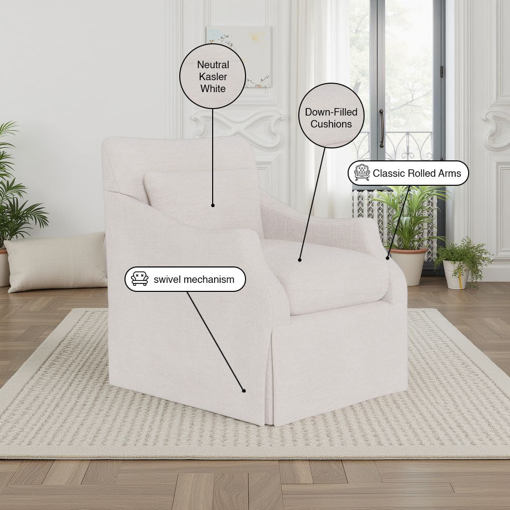 The Margaux Swivel Accent Chair is designed to make every corner of your home inviting. Here, it’s placed in a warm, softly lit living room, showing just how effortlessly it blends with surrounding décor. Its Kasler Cream fabric adds a bright, uplifting tone, while the tailored slipcover gives it a refined, timeless edge.