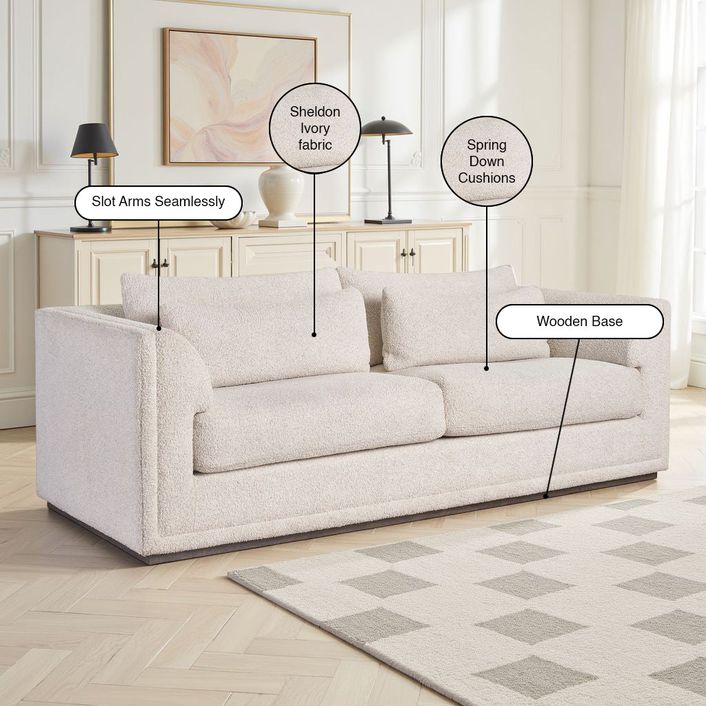 The Theo 3-Seater Sofa is crafted to bring comfort and elegance into your home. Upholstered in Sheldon Ivory fabric, it offers a soft yet durable texture that resists everyday wear while keeping a refined look. Designed with slot arms that flow seamlessly into the frame and a sleek wooden base, it combines modern style with timeless craftsmanship.